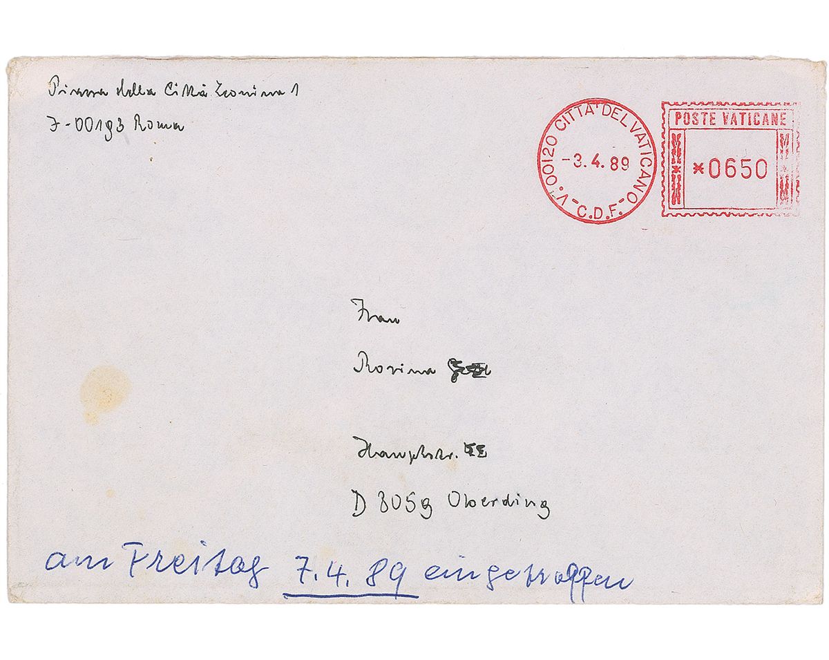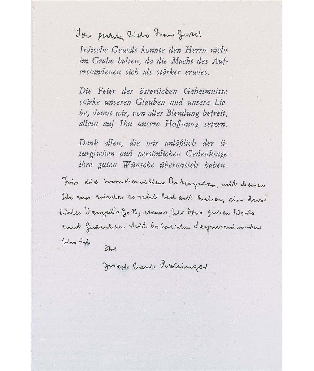 ALS in German, signed “Joseph Card. Ratzinger,” one page inside an Easter greeting card, 4.5 x 6.75, no date but postmarked April 3, 1989. In full (translated): “Thank you for your wonderful Easter presents, which you have given to us again, a warm, heavenly thank you, as well as for your good words and thoughts. With Easterly blessings.” In fine condition, with a trivial brush to the signature. Accompanied by the original mailing envelope, addressed in his own hand.