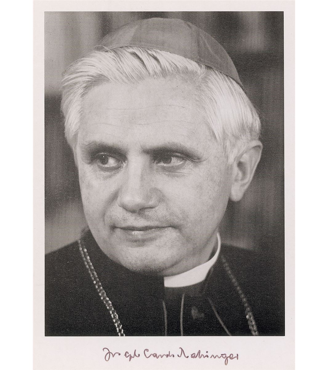 Desirable 4.25 x 5.75 cardstock photo of the pope emeritus as a cardinal, signed in the lower border in black ink, “Joseph Card Ratzinger.” In fine condition.
