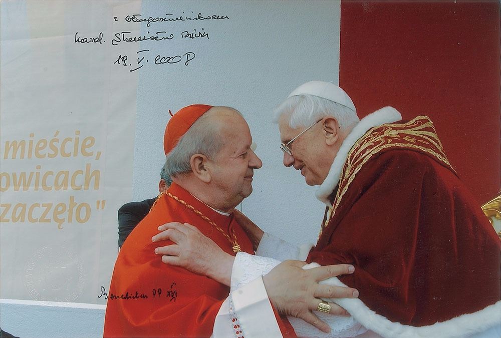 Color glossy 11.75 x 8 photo of Pope Benedict XVI embracing a cardinal, signed below in black felt tip, "Benedictus PP XVI." Signed in the upper portion in black felt tip by an unknown hand, dated "19.V.2008." Blindstamped in the lower left with the papal seal. In fine condition.