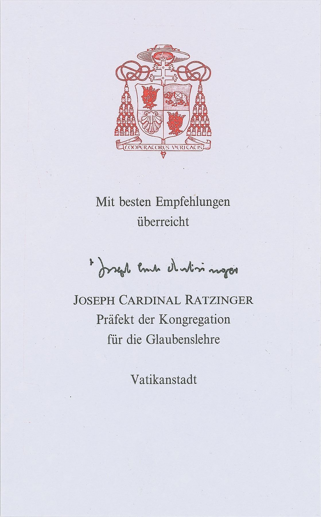 Ink signature, "Joseph Card. Ratzinger," on an off-white 3.5 x 5.75 presentation card in German, reading (translated): "Presented with the best recommendations…Prefect of the Congregation for the Doctrine of Faith, Vatican City." In very fine condition. Accompanied by a prayer card and cardstock photo, with the former bearing a preprinted facsimile signature.