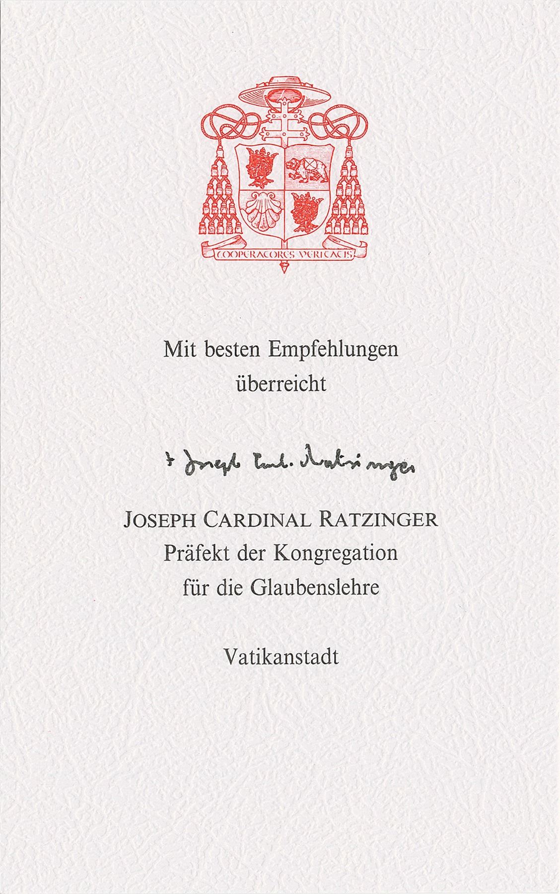 Ink signature, "Joseph Card. Ratzinger," on an off-white 3.5 x 5.75 presentation card in German, reading (translated): "Presented with the best recommendations…Prefect of the Congregation for the Doctrine of Faith, Vatican City." In very fine condition. Accompanied by a prayer card and a cardstock photo, with the former bearing a preprinted facsimile signature.