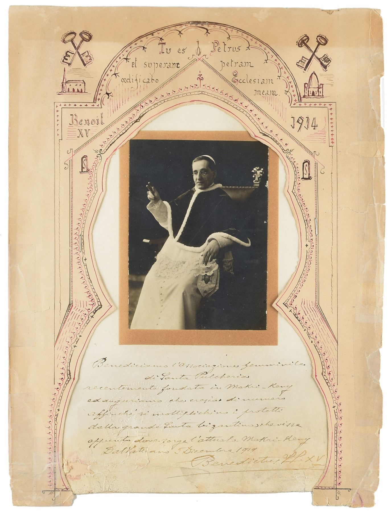 Uncommon apostolic benediction in Latin and Italian, signed "Benedictus P.P. XV," one page, 10.75 x 14, December 5, 1919. An untranslated apostolic blessing featuring a calligraphic inscription and an affixed photo of Pope Benedict with an attractive hand-embellished border. In good to very good condition, with creasing, toning, and a repaired hole to the signed area; and damage, tears, and loss along the edges repaired with clear tape.