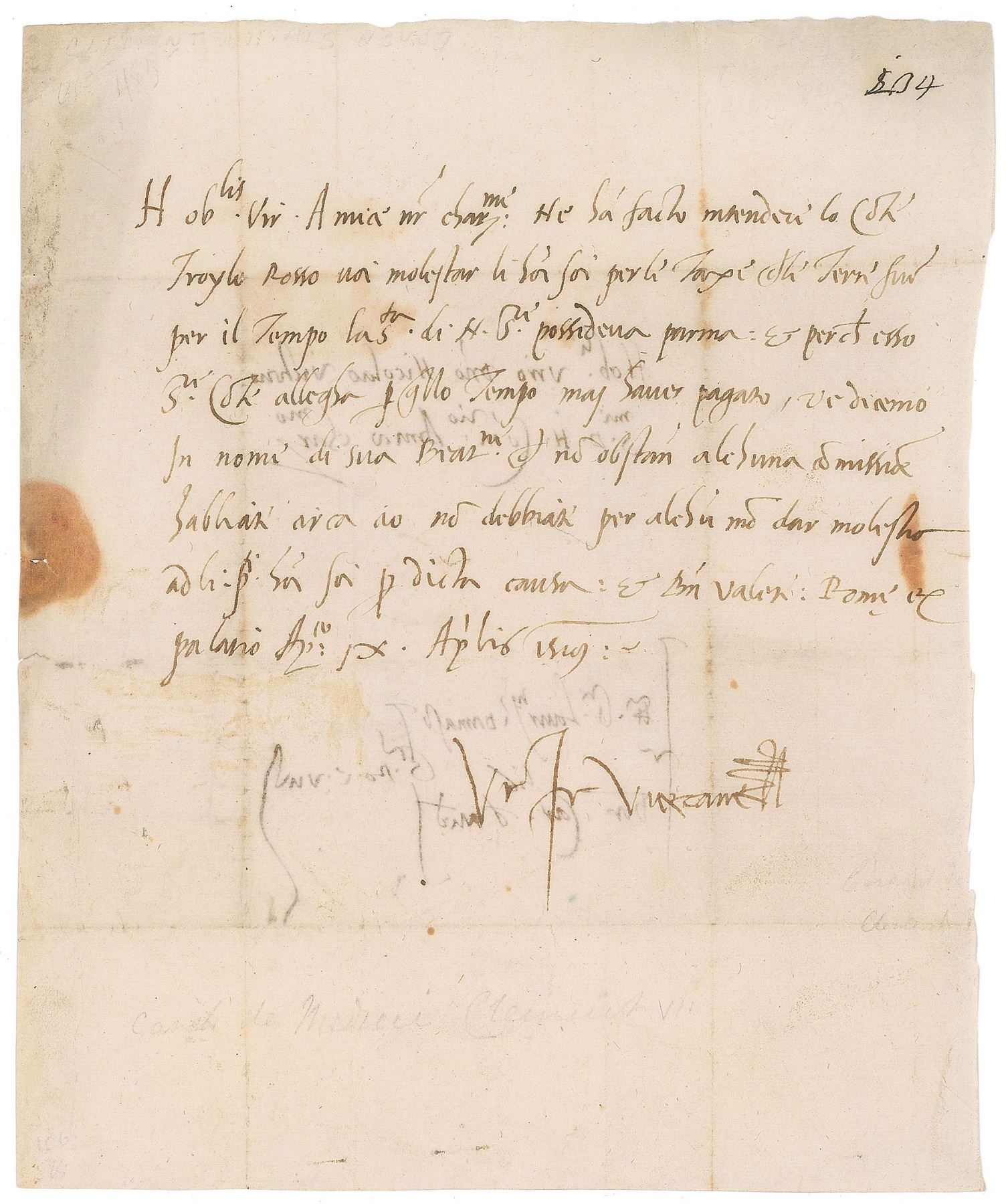 Born Giulio di Giuliano de Medici in 1478, he served as pope from November 1523 until his death in 1534; the Sack of Rome and English Reformation occurred during his papacy. Extremely rare ALS as the Archbishop of Florence, one page, 7.75 x 9.25, April 9, 1519. Written from Rome, at the Apostolic Palace, a letter to Nicholas Victor, sending instructions to cease actions against an Italian nobleman concerning taxes owed to the Church, in full: "I have let Count Troylo Rossos know that he should not be molested about the taxes on his lands for the period of the Holiness of Our Lord which he possessed in Parma. And because the Count alleges to have paid us for that period, we cede in it the name of His Holiness. And although there is nothing whatever here to show for it I don’t want him to be bothered further in this matter. And so farewell." In fine condition, with two seal-related stains. Given that Clement VII penned this letter from the Apostolic Palace, he was very likely visiting his cousin, Leo X, who was then into the sixth year of his papacy. Letters entirely in the hand of Clement VII are excessively rare.