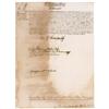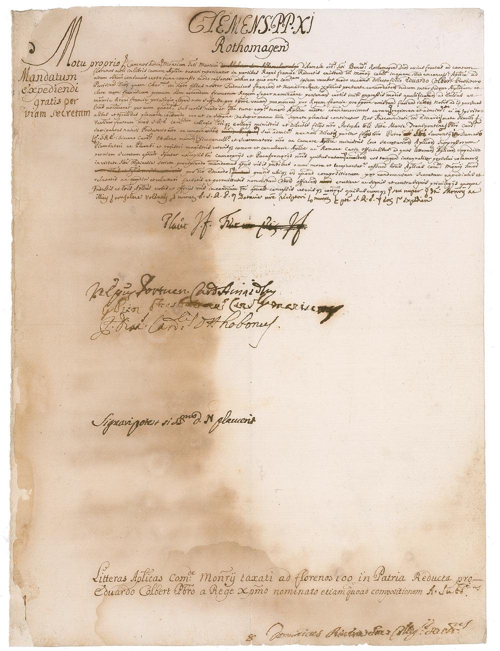 Italian pope (1649–1721), born Giovanni Francesco Albani, who ascended the papal throne in 1700 and served until his death. Manuscript DS, in Latin, signed “Fiat - J.F.,” one page, 8 x 10.75, no date. Untranslated Motu proprio, signed in the center by Clement. In very good condition, with moderate toning and soiling to left side, lightly affecting signature, mounting remnants to reverse left edge, and a partial separation along central vertical fold. According to the consignor, the pope was most likely at the beginning of his Papal Reign and a little inexperienced since he first signed Fiat ut petitur J.F. (the signature used for petitions) but being a Motu proprio Clement erased these words and signed again with the correct form Fiat J.F.