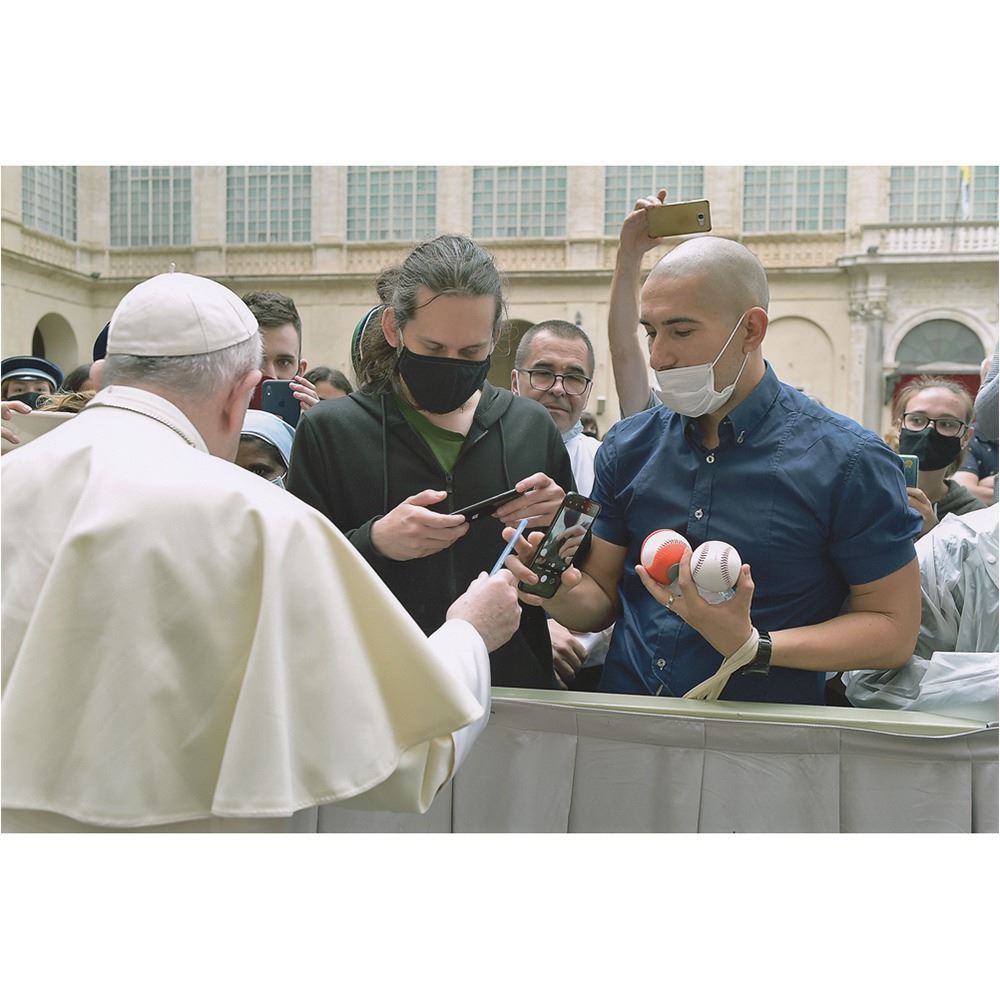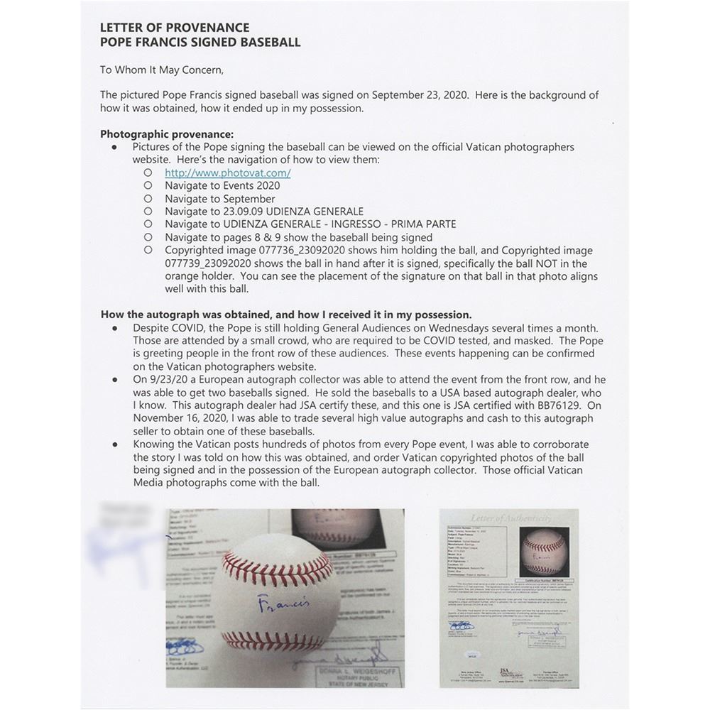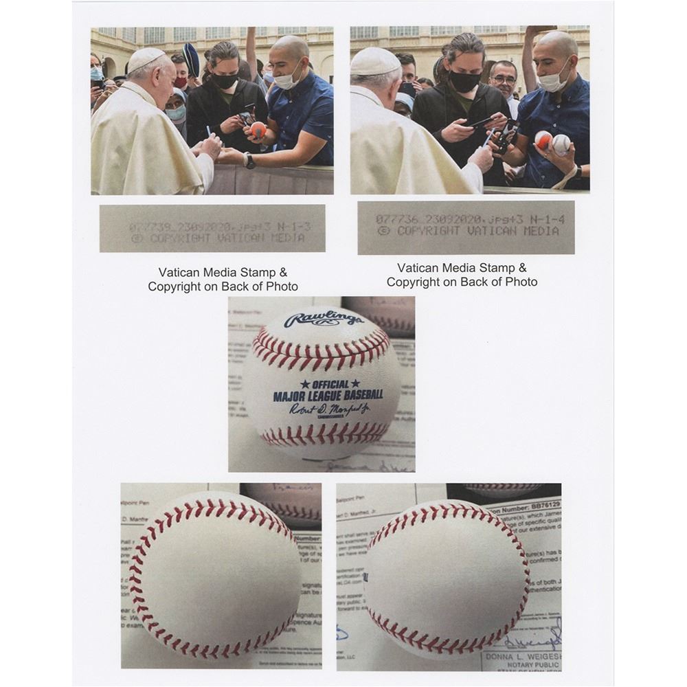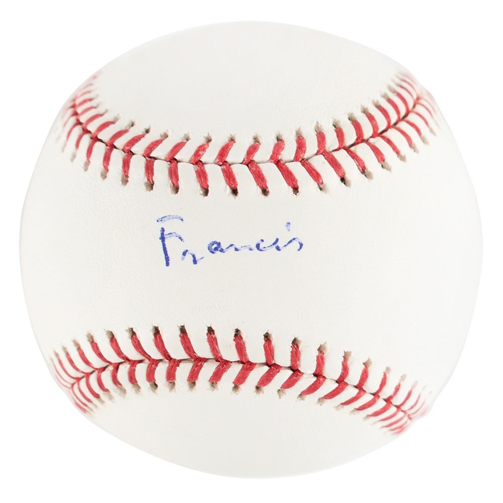 Remarkably rare official Rawlings Major League (Manfred) baseball signed in blue ballpoint on the sweet spot by Pope Francis, "Francis." In very fine condition. Accompanied by a color satin-finish 12 x 8 photograph from The Vatican taken at the time of signing on September 23, 2020, a full letter of authenticity from JSA, and a letter of provenance from the current owner, stating that it was obtained from the European autograph collector pictured via a dealer in the USA. Baseballs are a highly desirable format for any autograph, and this papal treasure is unlike any we have previously seen.