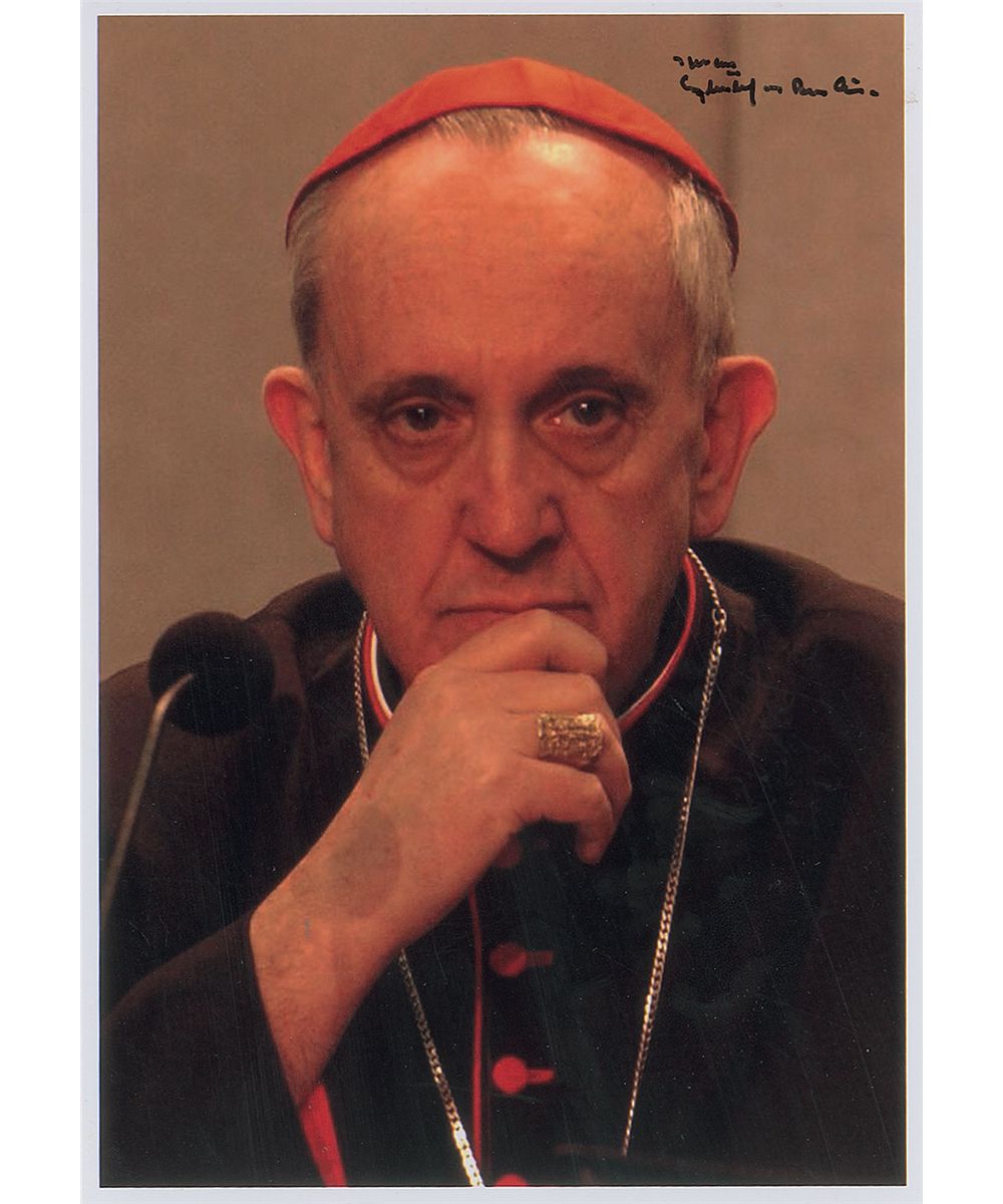Color satin-finish 5.75 x 8.25 photo of Pope Francis as a cardinal, signed in black felt tip, adding “Archbishop of Buenos Aires,” beneath his signature in German. In very fine condition. Accompanied by a photo from the time of signing. Consignor notes that this was signed at a reunion of cardinals in Rome during 2012.