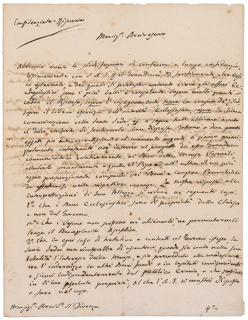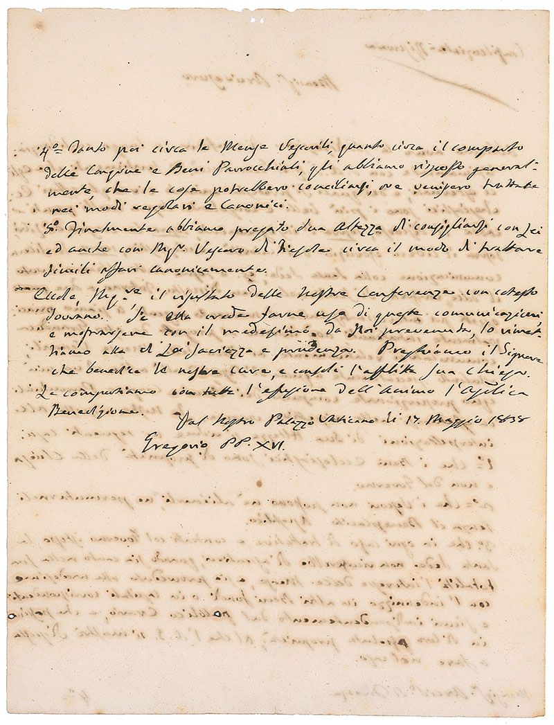 Born Bartolomeo Alberto Cappellari (1765-1846), he was Pope of the Catholic Church from 1831 to 1846. Strongly conservative and traditionalist, he opposed democratic and modernizing reforms in the Papal States and throughout Europe, seeing them as fronts for revolutionary leftism, and sought to strengthen the religious and political authority of the papacy. ALS in Italian, signed “Gregorio PP. XVI,” one page both sides, 7.75 x 10.25, May 17, 1838. Untranslated letter to the Archbishop of Florence, Ferdinando Minucci. Central vertical and horizontal folds, moderate show-through from writing on opposing sides, and trivial spots of ink erosion to a few single letters, otherwise fine condition.