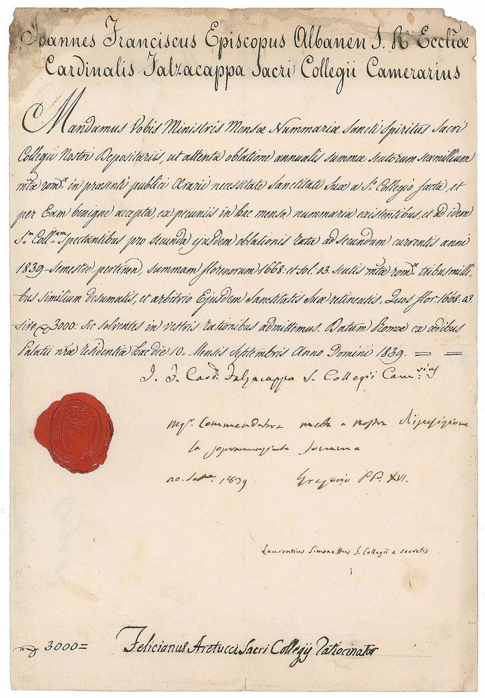 Born Bartolomeo Alberto Cappellari (1765-1846), he served as pope from 1831 to 1846. Strongly conservative and traditionalist, he opposed democratic and modernizing reforms in the Papal States and throughout Europe, seeing them as fronts for revolutionary leftism, and sought to strengthen the religious and political authority of the papacy. Autograph endorsement, signed "Gregorio PP XVI," one page, 8.5 x 12.5, September 20, 1839. Letter in Italian from Joannes Franciscus Cardinal Falzacappa, who advises of a payment of an annual offering to the Pope by the priests of the Holy Spirit Order of the Sacred College. Endorsed at the conclusion by Pope Gregory, who commends the order for its offering. Lower left retains original red wax seal. In fine condition, with some water staining along top edge.