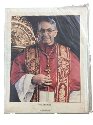 Pope John Paul 1 (ca. 1978). A commemorative color photo printed on paper that was distributed in the Sunday Bulletin newspaper. The photo comes inside a plastic sleeve with a cardboard backing. The are creases, stains and minor edge wear damage. Very Fine. (10.5" X 13.5").