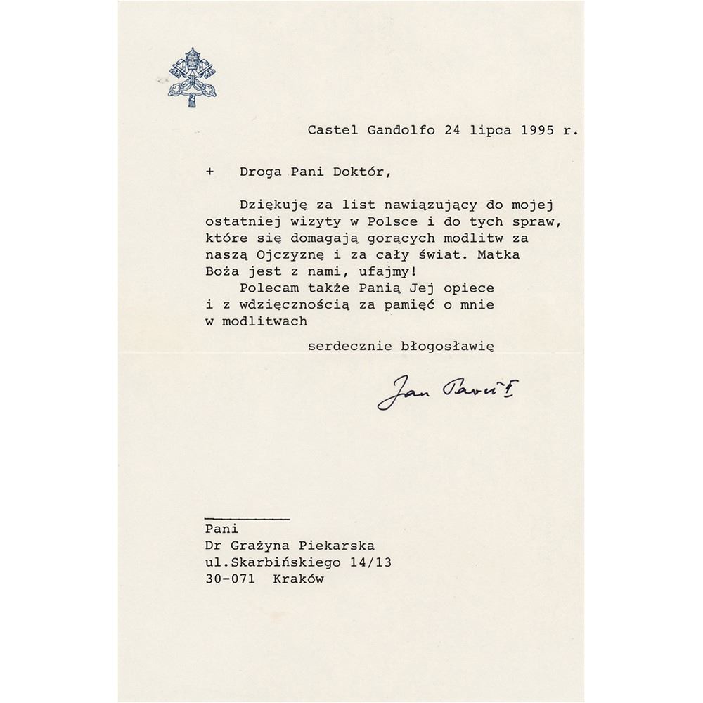 TLS in Polish, signed “Jan Pawel II,” one page, 5.5 x 8.25, Papal regalia and insignia letterhead, July 24, 1995. Addressed from Castel Gandolfo, a letter to Dr. Grazyna Piekarska, in full (translated): "Thank you for the letter referring to my last visit to Poland and to those matters that require fervent prayers for our homeland and for the whole world. Mother of God is with us, let's trust! I also entrust the Lady to her protection and with gratitude for remembering me in my prayers." In fine condition.