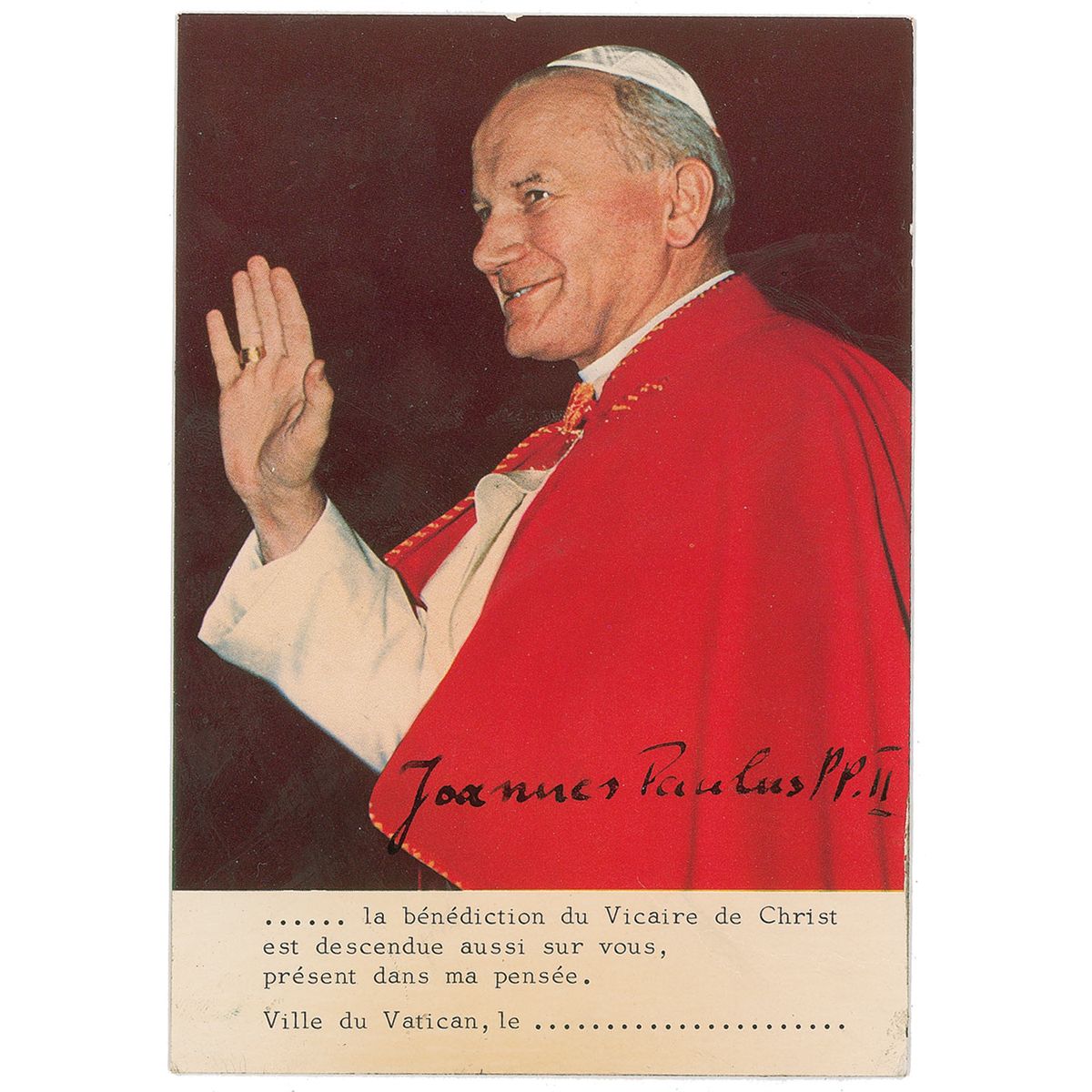 Color 4 x 6 heavy cardstock photo of the Holy Father waving to an unseen audience, signed in black ink, “Joannes Paulus PP II.” In very good to fine condition, with some scattered light surface marks and dings, light crazing along bottom border, and some slight discoloration to finish from what appears to be a previous spill.