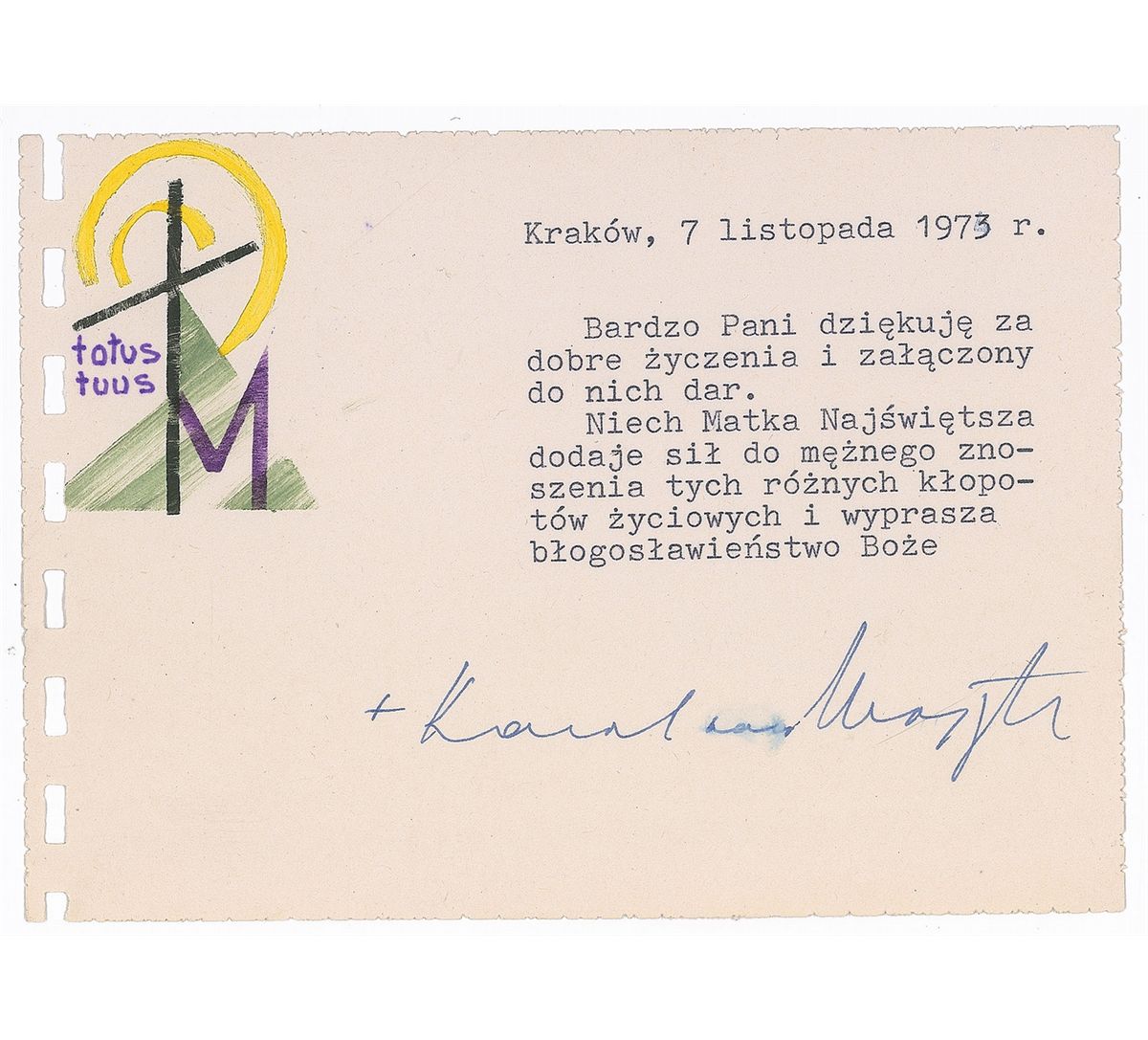 TLS in Polish, signed “Carol card Wojtyla,” one page, 5.75 x 4, spiritual Latin letterhead, November 7, 1973. Brief letter of thanks for a gift. In fine condition, with a small brush to center of signature.