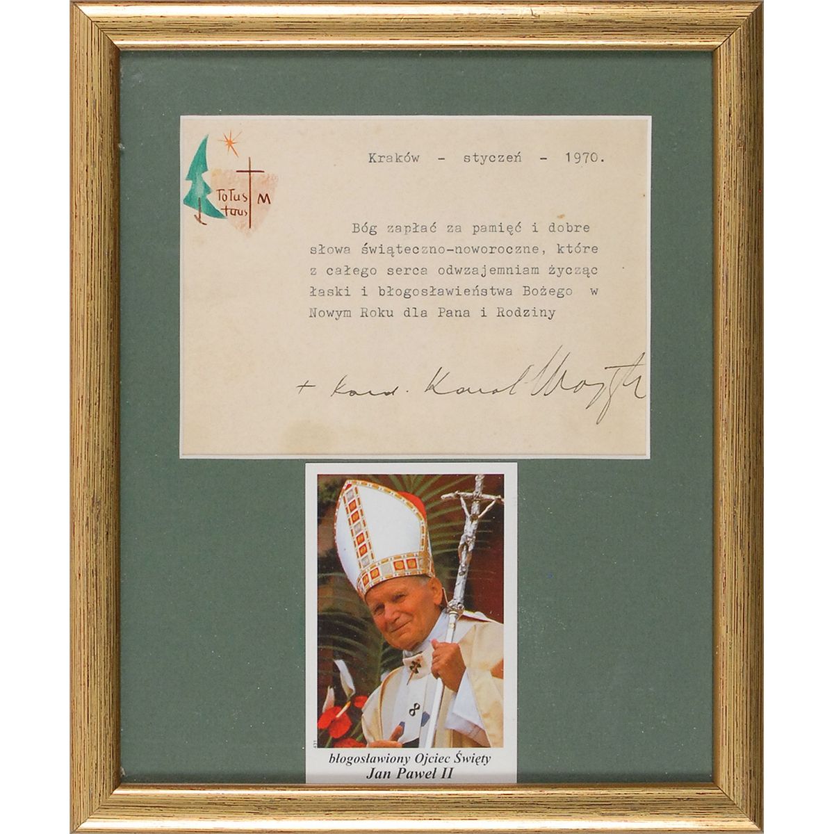TLS in Polish, signed “Card. Karol Wojtyla,” one page, 5.5 x 4, illustrated Christmas-themed letterhead, January 1970. A heartwarming holiday message. In full (translated): “God bless you for your Christmas and New Year wishes, they are much appreciated. From my heart I send you God’s blessing for the New Year for you and all your family.” Matted and framed with an affixed image to an overall size of 8.5 x 10. In fine condition, with mild toning.