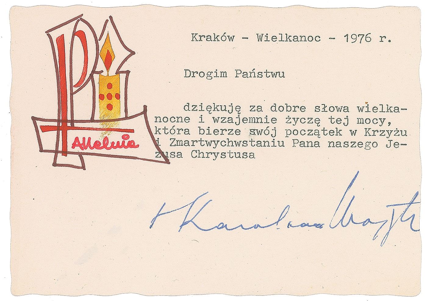 TLS in Polish, signed “Karol card Wojtyla,” one page, 5.75 x 4.25, Easter 1976. In full (roughly translated): "Thank you for the good words of Easter and to each other the power of this day, which takes its origin in the Cross of Christ Jesus." Card bears a celebratory drawing in an unknown hand. In fine condition.