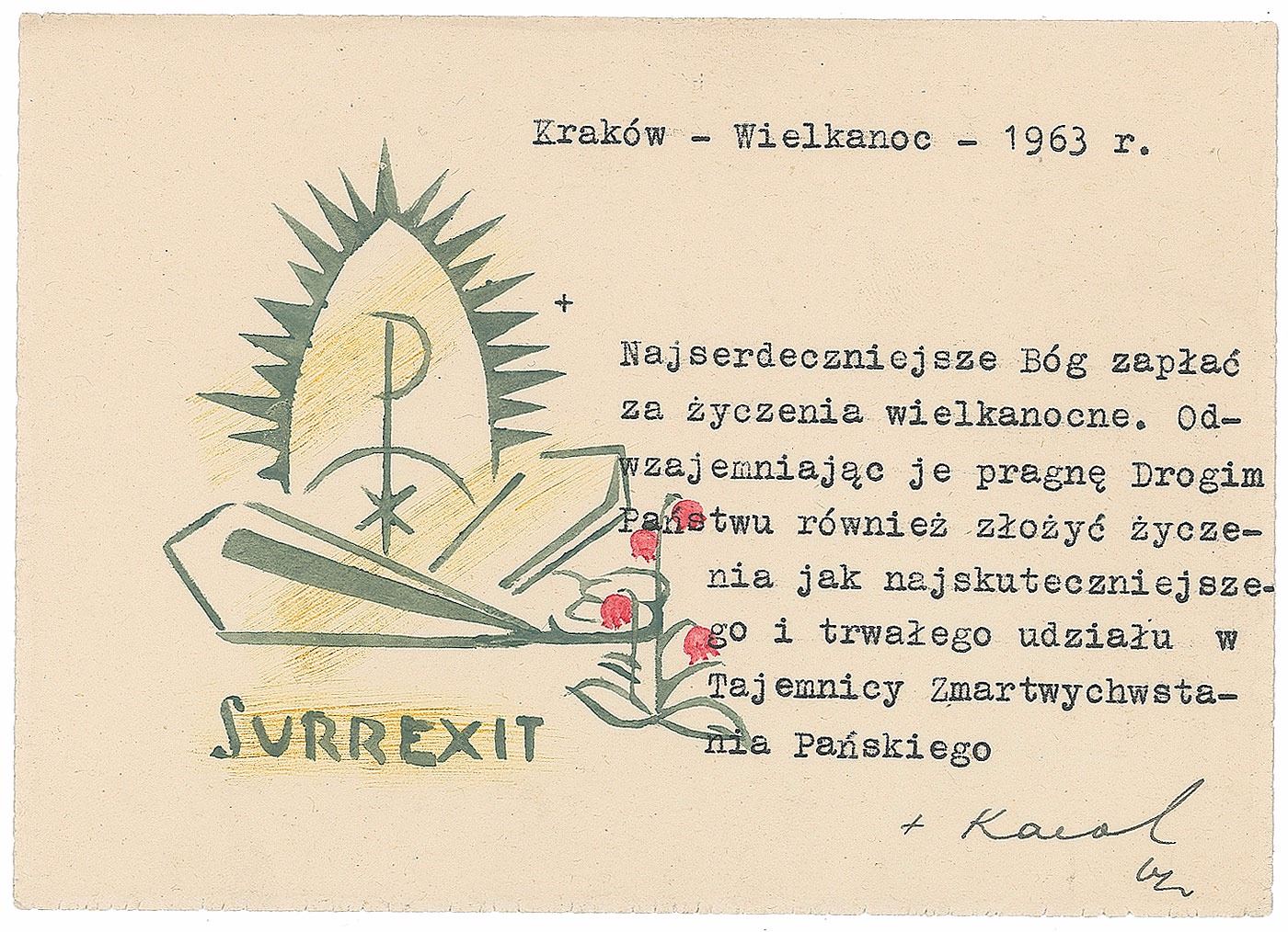 TLS in Polish, signed “Karol c W,” one page, 5.75 x 4, Easter 1963. In full (roughly translated): "The most honorable God pay for Easter wishes. In reciprocating their desire, Dear Panetwu also wishes to have the most effective and lasting participation in the Mystery of Struggle." Card bears a celebratory drawing in an unknown hand. In fine condition.