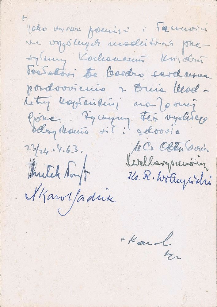 Untranslated LS in Polish, signed “Karol W.,” one page on the reverse of a 4 x 5.75 postcard depicting an image of the Black Madonna, dated to late April 1963. The body of the letter is written by an unknown hand and signed by five others. In fine condition.