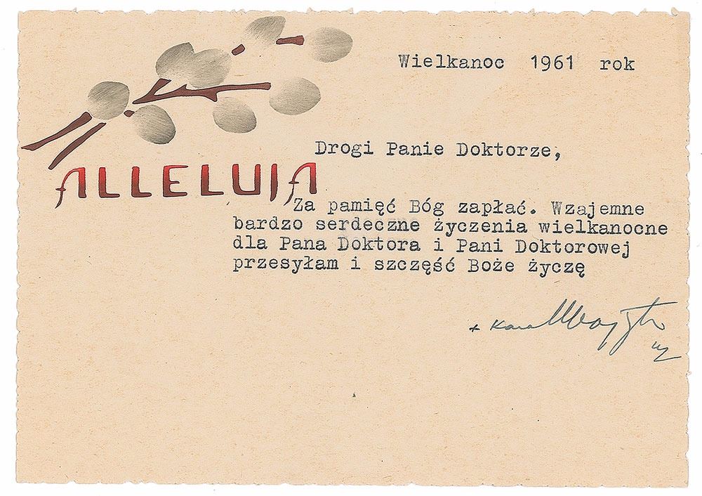 TLS in Polish, signed “Karol Wojtyla,” one page, 5.75 x 4, illustrated "Alleluia" letterhead, Easter 1961. Letter to a doctor, in full (translated): "God bless you for remembering. Very happy Easter greetings to the Doctors, and I send the blessing." In fine condition.