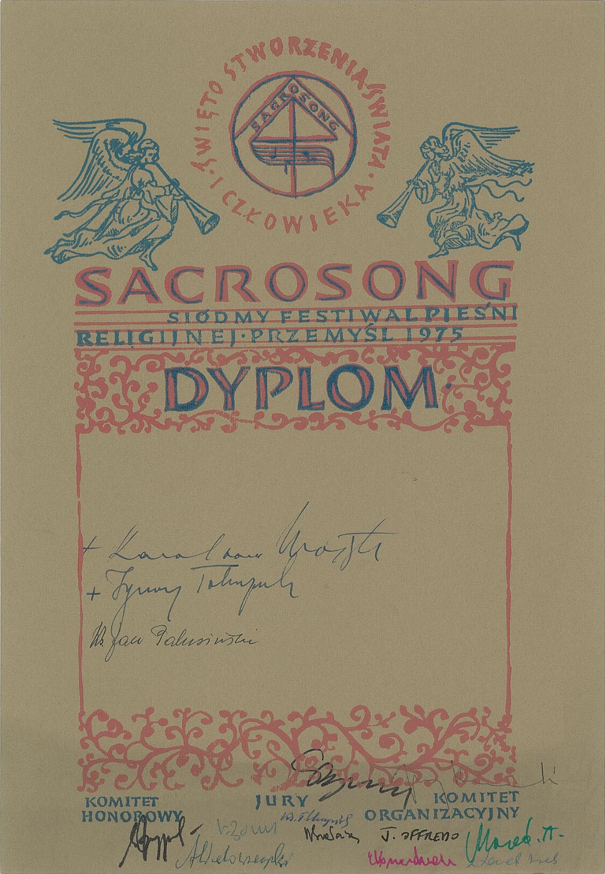 Desirable woodblock-print diploma from the 1975 Polish Festival of Sacrosong, 9 x 13, signed in the center in bold ink, "Karol card. Wojtyla," and signed along the bottom by various committee members. In fine condition. The Sacrosong Festival was a cultural movement that helped preserve Catholic identity in Poland during the Cold War, and was supported by the future Pope John Paul II.