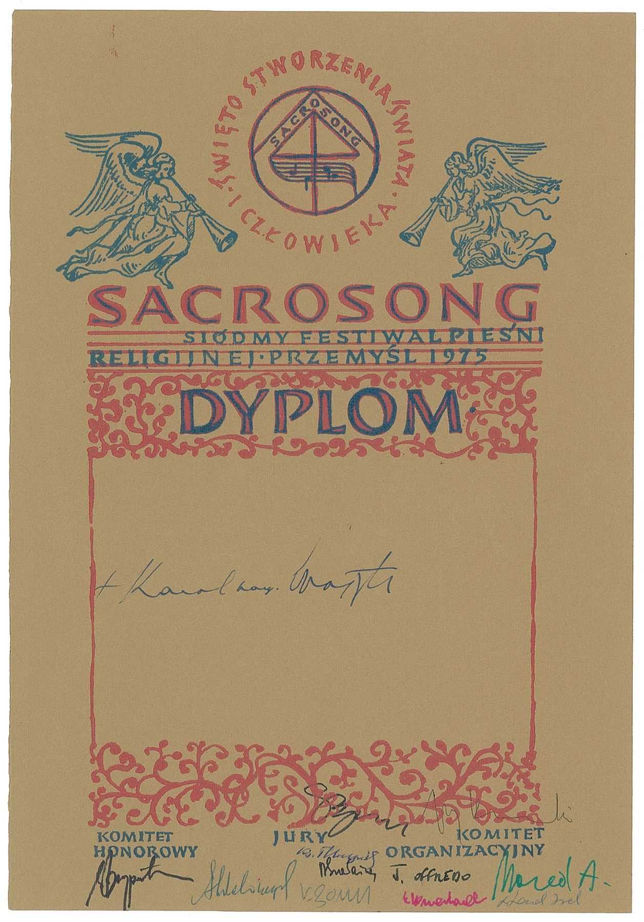 Desirable woodblock-print diploma from the 1975 Polish Festival of Sacrosong, 9 x 13, signed in the center in bold ink, "Karol card. Wojtyla," and signed along the bottom by various committee members. In fine condition. The Sacrosong Festival was a cultural movement that helped preserve Catholic identity in Poland during the Cold War, and was supported by the future Pope John Paul II.