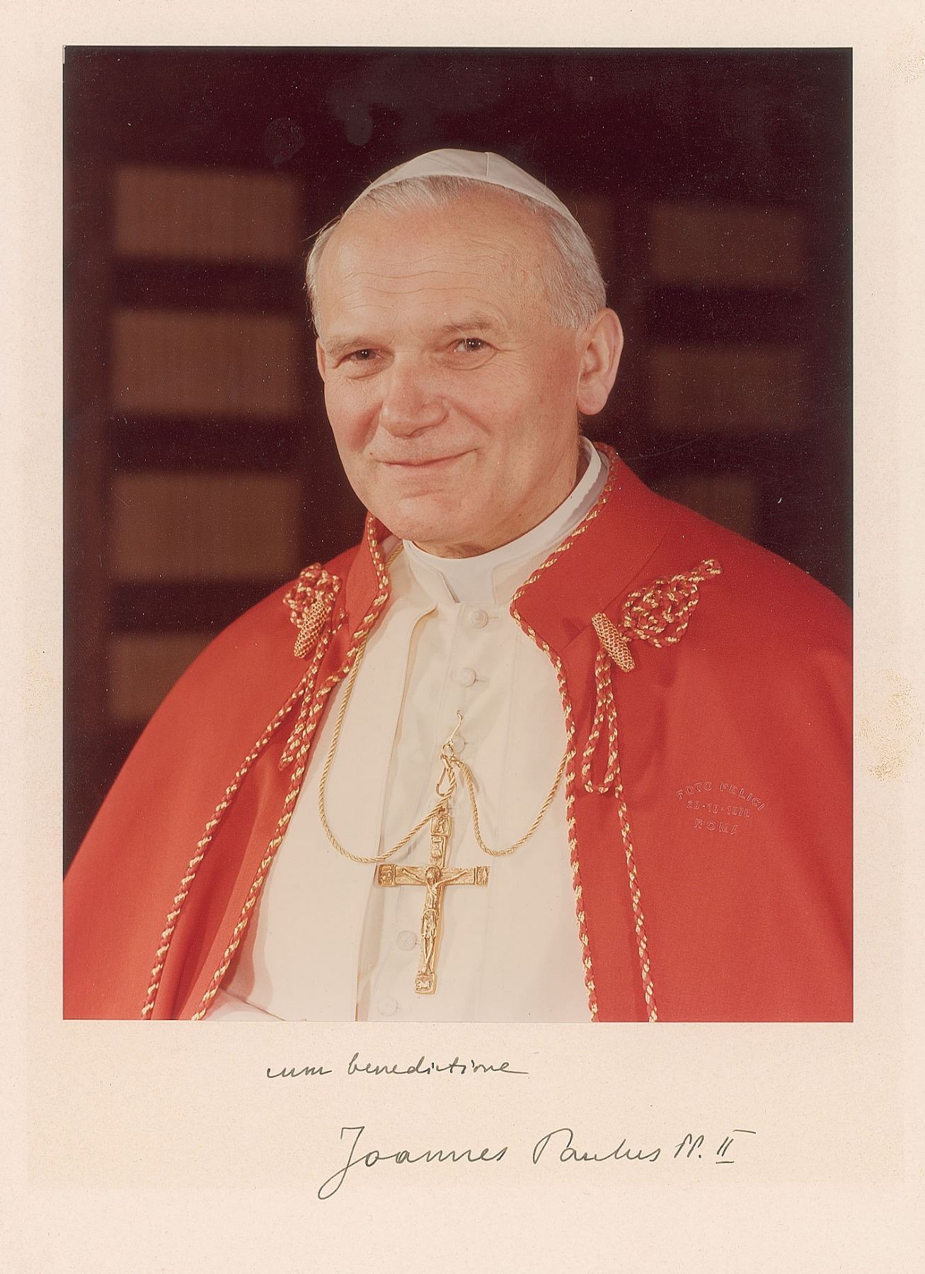 Exquisite color 8 x 10 portrait of Pope John Paul II, affixed to its original 9.5 x 13 mount, signed on the mount in fountain pen, "una beneditione, Joannes Paulus PP. II." The portrait is blindstamped by the photographer, "Foto Felici, 20-10-1978, Roma." In fine condition, with light toning to the mount. Pope John Paul II had been elected by the papal conclave just four days before the date of this remarkable portrait. A splendid piece signed by the revered Catholic leader.