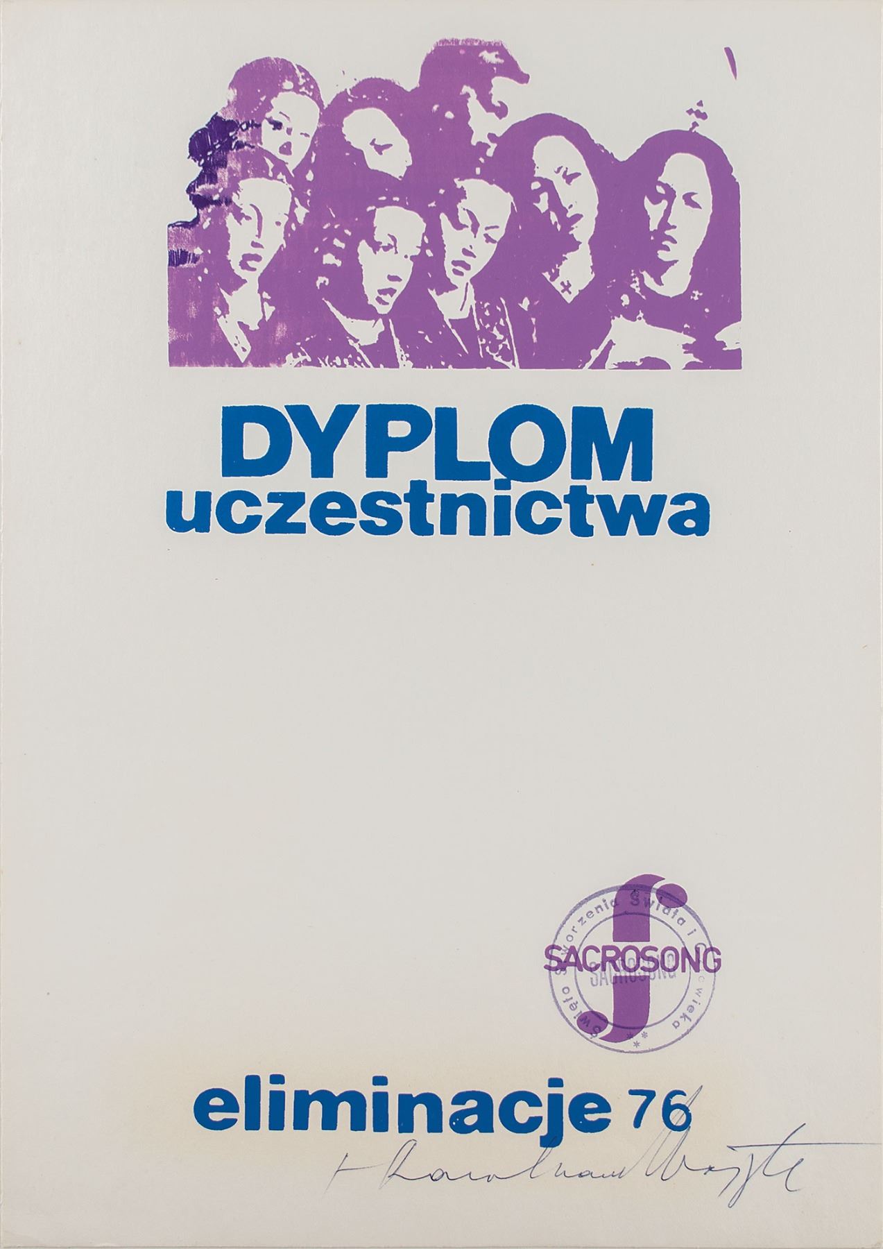 Desirable woodblock-print diploma from the 1976 Polish Festival of Sacrosong, 9.75 x 13.75, signed in the center in ballpoint, "Karol card. Wojtyla." In fine condition, with a bit of light creasing. The Sacrosong Festival was a cultural movement that helped preserve Catholic identity in Poland during the Cold War, and was supported by the future Pope John Paul II.