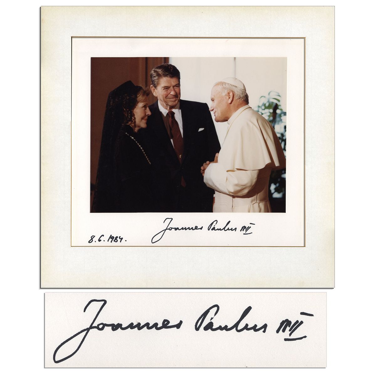 Pope John Paul II photo display signed. The Pope inscribes the mat below the image with black felt tip, ''Joannes Paulus pp. II / 8.6.1984''. Photo shows John Paul greeting Ronald and Nancy Reagan. Measures 14'' x 13.5'' overall. Faint toning to mat, else fine.