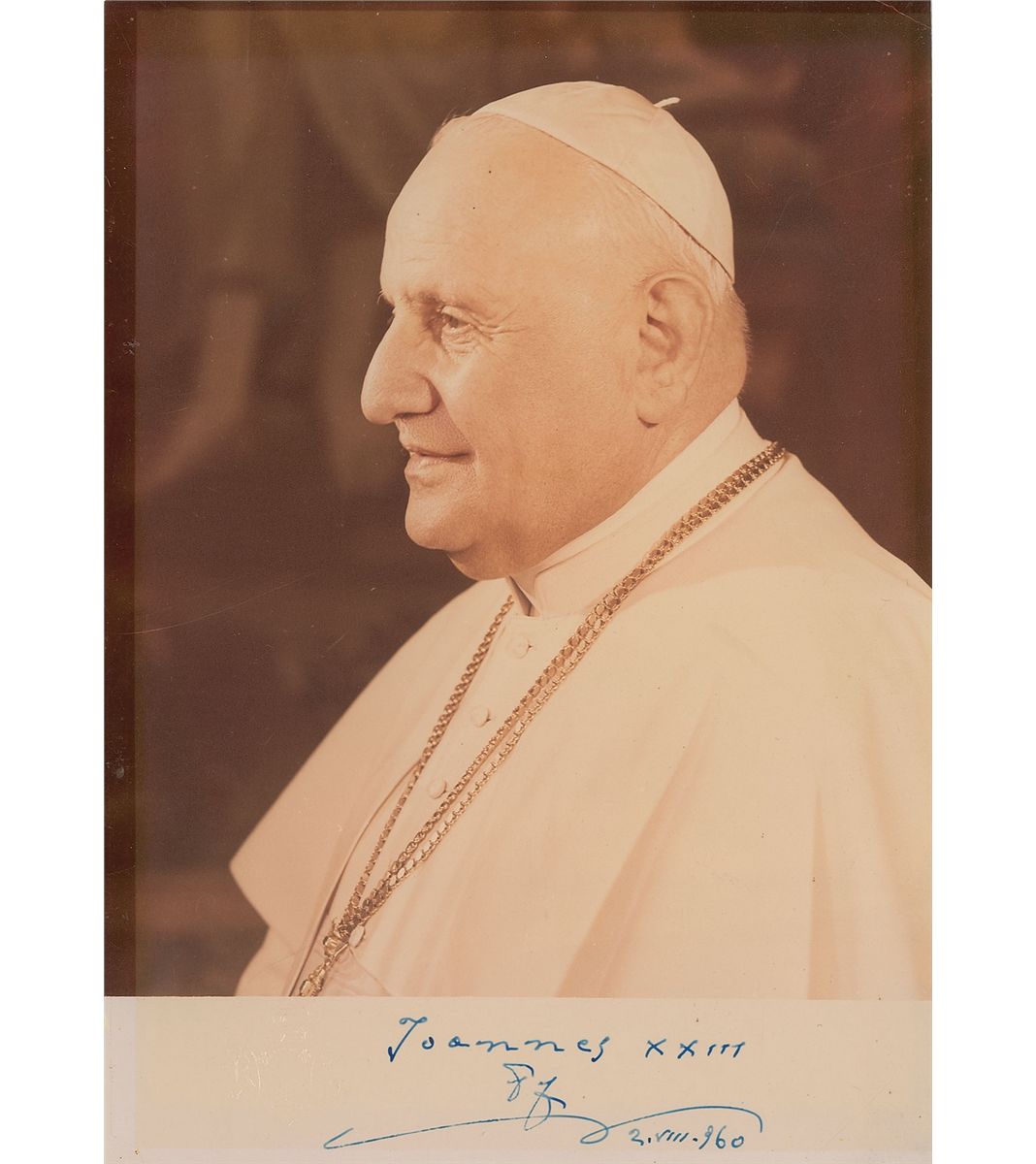 Italian Pope (1881–1963), born Angelo Giuseppe Roncalli, who ascended the papal throne in 1958 and served until his death. As the guiding force behind the historic Second Vatican Council, John ushered in the most sweeping reforms the Catholic Church had undergone in centuries. Rare color glossy 6.75 x 9.5 photo of Pope John XXIII, signed in the lower border in fountain pen, “Joannes XXIII,” and dated “August 2, 1960.” The lower border also bears an embossed papal seal. A crease and paperclip impression to top edge, a subtle overall block of toning, and uniformly trimmed edges, otherwise fine condition. All examples of John XXIII we have previously offered were signed as cardinal using his given name, making this an especially rare piece; it is also the only color photo of him that we have ever encountered.