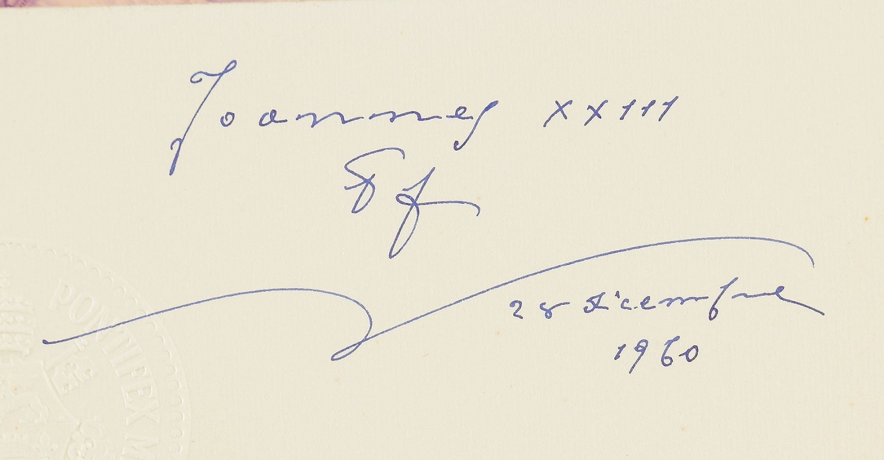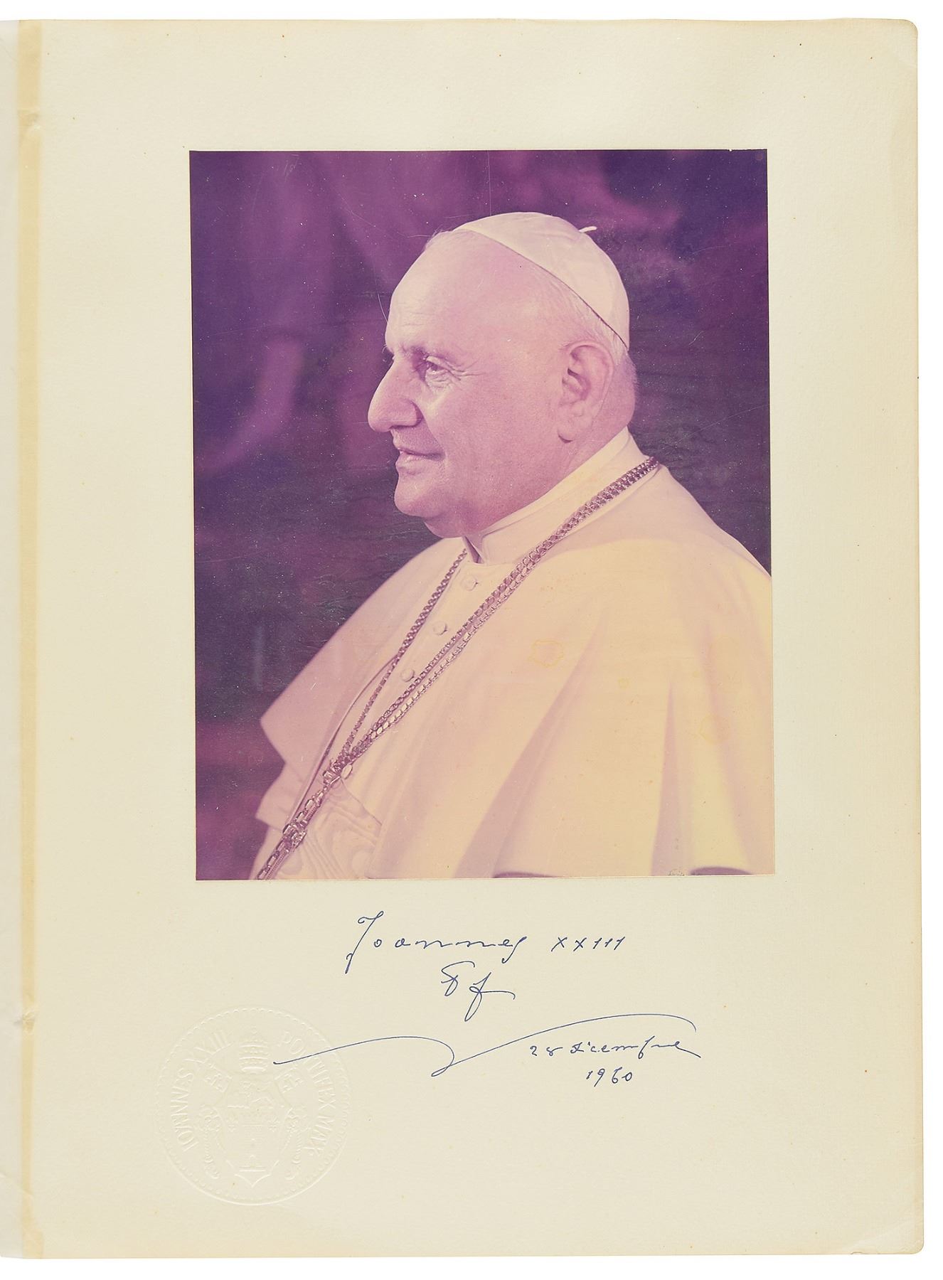 Color matte-finish 7 x 8.75 photo of Pope John XXIII in his papal robes, affixed to its official 11 x 15 mount embossed with his official seal, signed on the mount in blue ink, "Joannes XXIII PP, 28 Dicembre 1960." In fine condition, with some creasing to the corners of the mount.