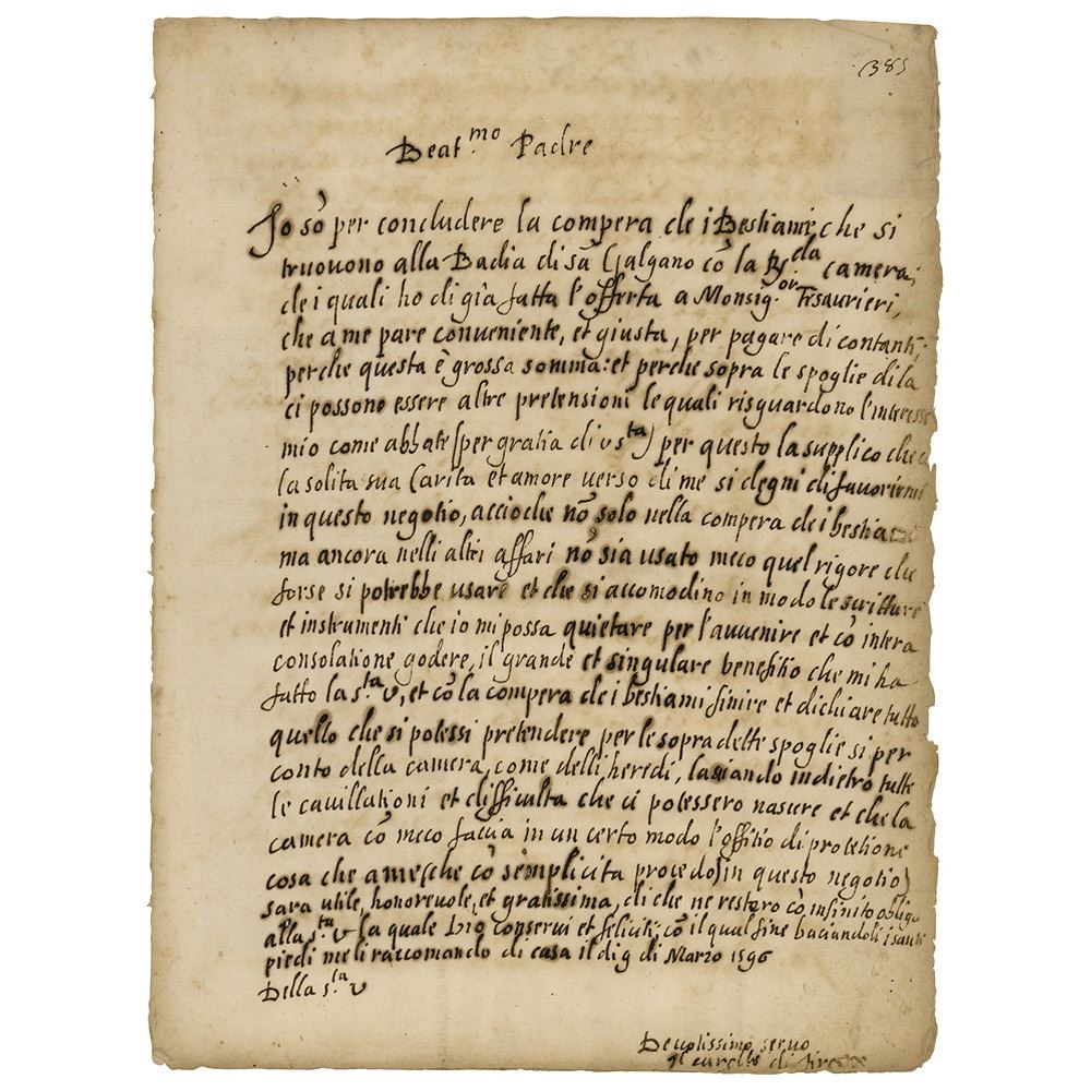 Born Alessandro Ottaviano de Medici in 1535, he served as pope from April 1–27, 1605; his pontificate is one of the briefest in history, having lasted under a month. Incredibly rare ALS in Italian, signed “Il Card. di Firenz,” one page, 8 x 11, March 10, 1596. Untranslated handwritten letter to Pope Clement VIII, addressed to "Beat'mo Padre," written by the future Pope Leo XI as Cardinal of Florence. In very good to fine condition, with partial separation along the hinge and some tiny losses to the signature area. An extraordinary piece of papal correspondence.
