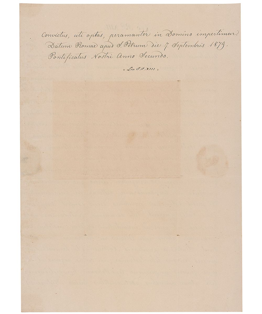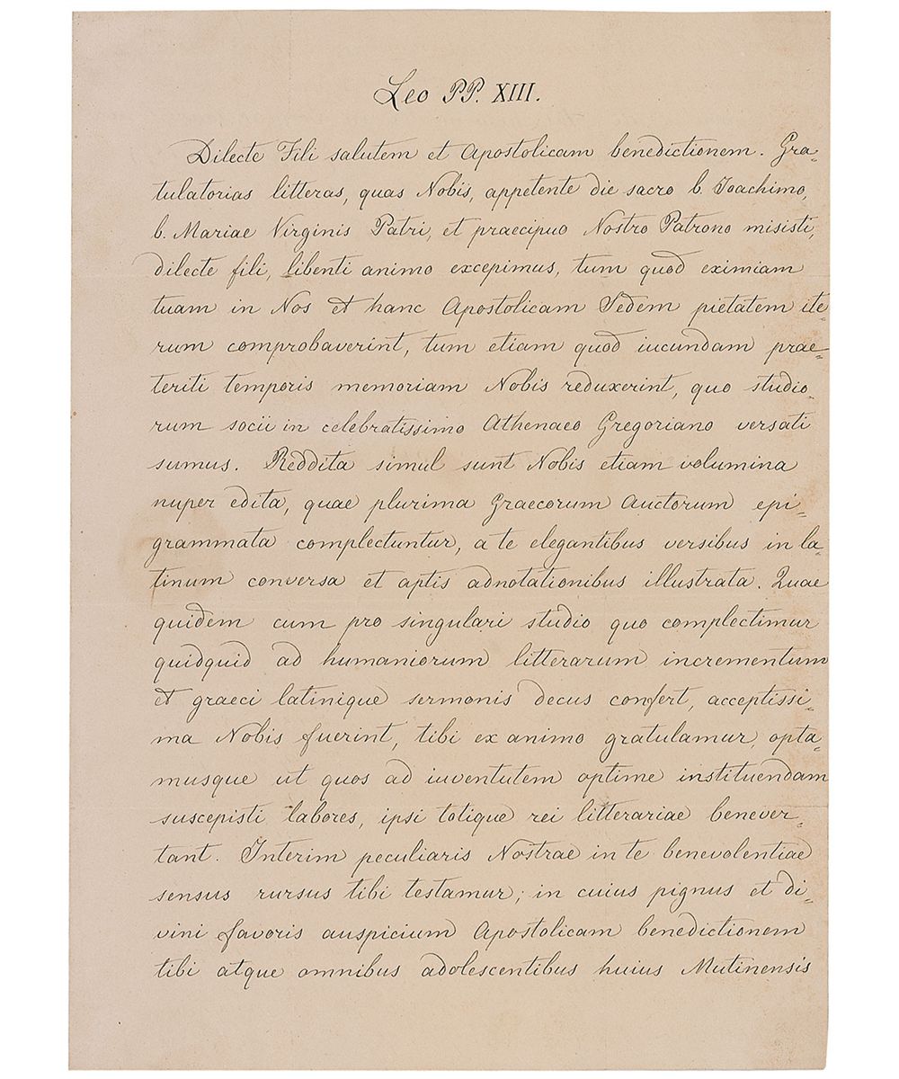 Born Count Vincenzo Gioacchino Raffaele Luigi Pecci (1810-1903), he was the 256th Pope of the Roman Catholic Church, reigning from 1878 to 1903, succeeding Pope Pius IX. LS in Latin, signed “Leo pp. XIII,” one page both sides, 9.25 x 12.75, September 7, 1879. Letter to “Our Beloved Son John–Baptist Tarasconi–Modena,” In part (translated): “Greetings and the Apostolic Benediction to our Beloved Son…a new proof of your piety and devotion to Us and the Holy Sea…You brought back happy memories of the past to Us when We were immersed in studies at the Pontifical Gregorian University. You have made elegant translations in Latin verse and provided fitting notes…a great contribution to humanist studies, Latin and Greek letters… from Our heart we congratulate you and bestow the Apostolic Benediction on you.” Second integral page bears an address panel in another hand and retains most of the red wax seal. In very good condition, with intersecting folds, some scattered light toning, with a few heavier circular areas of toning from seal, a bit of trivial paper loss along a couple folds, and paper loss to second page from seal.