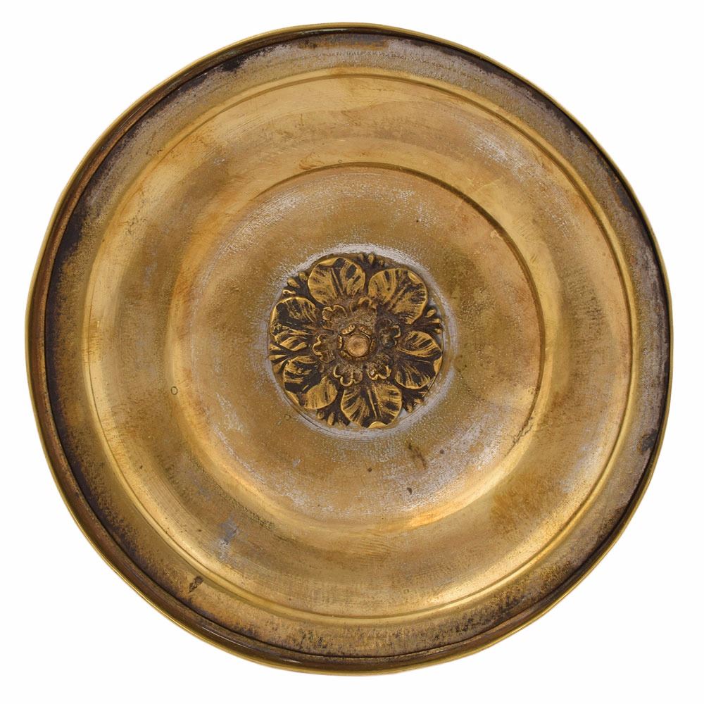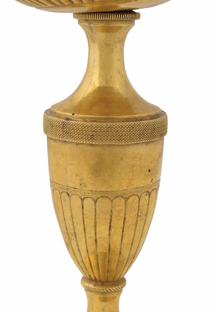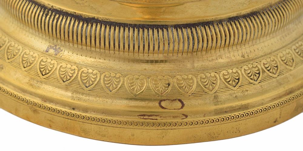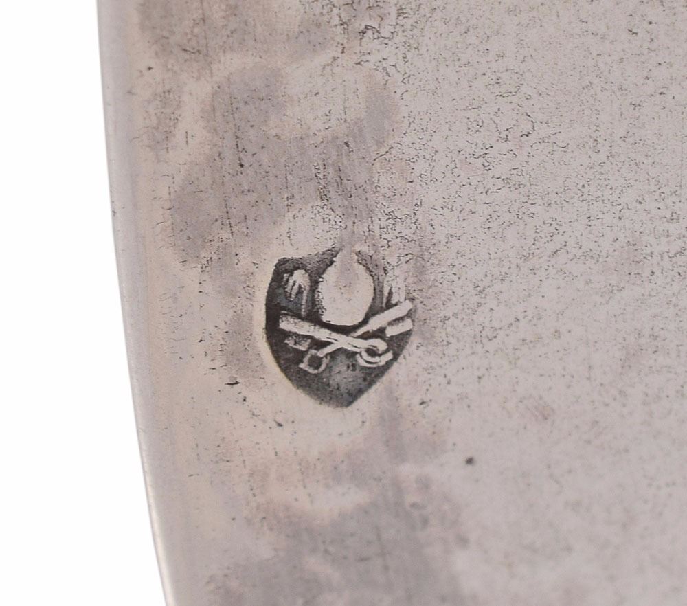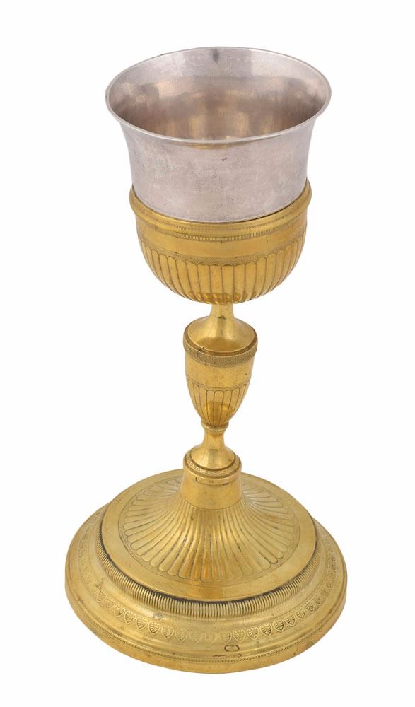 Chalice from the time of Pope Leo XII, composed of a silver cup with a gilded bronze sleeve, knop, and base, impressed in the upper lip with the maker's mark of the Papal States (the crossed keys and tiara) that was in use from 1814 to 1870. The body of the piece is hand chased with great precision, displaying tiny florets on the urn like knop, and palm fronds encircling the foot. The piece measures approximately 9.25? tall with a base diameter of 4.75?. In fine condition, with expected wear and no additions or restorations. The consignor notes that the chalice was purchased in an antique shop on the Via Santa Caterina da Siena in Rome. The crossed keys and tiara maker's mark was adopted by fine metalsmiths in the Papal States in the jubilation that followed Napoleon's release of Pope Pius VII from captivity and his triumphant return to Rome in 1814. The use of this mark continued until 1870, when the Papal States were taken over by a united Italy. Created when the Papal States were still in existence, this chalice is a symbol of the magnificence of the church's presence in the 19th century.