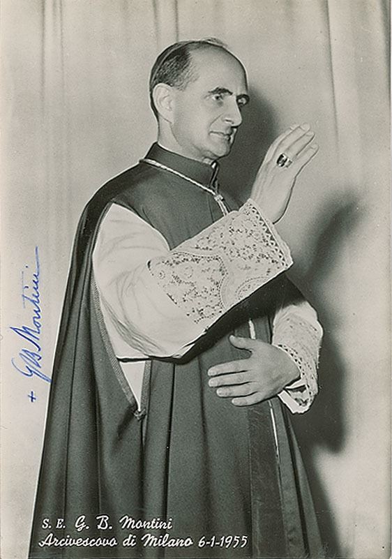 Vintage glossy 4 x 5.75 photo of the future pope as Archbishop of Milan, signed and inscribed in blue ballpoint, "G. B. Montini.” In fine condition.