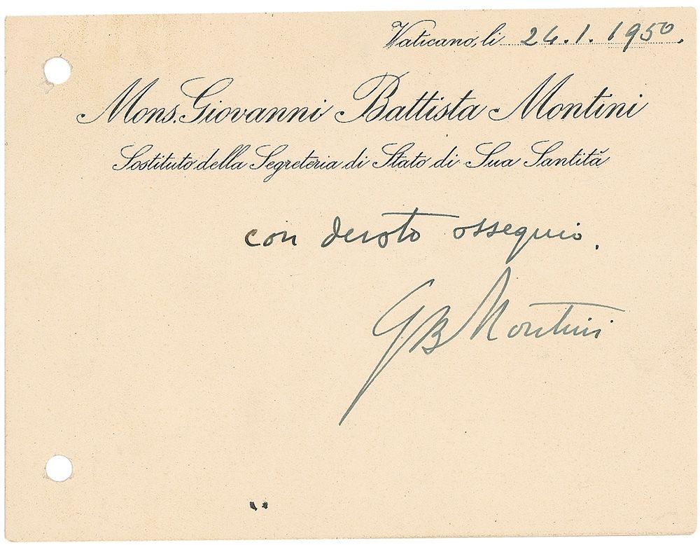 Born Giovanni Battista Enrico Antonio Maria Montini in Italy in 1897, Paul VI reigned as pope from 1963 until his death in 1978. Vintage ink signature, “G. B. Montini,” adding a brief Italian sentiment above his signature, and dated “January 26, 1950,” on an off-white 5.5 x 4 Secretary of State card. In fine condition, with two punch holes to left edge and a couple of light creases and impressions.