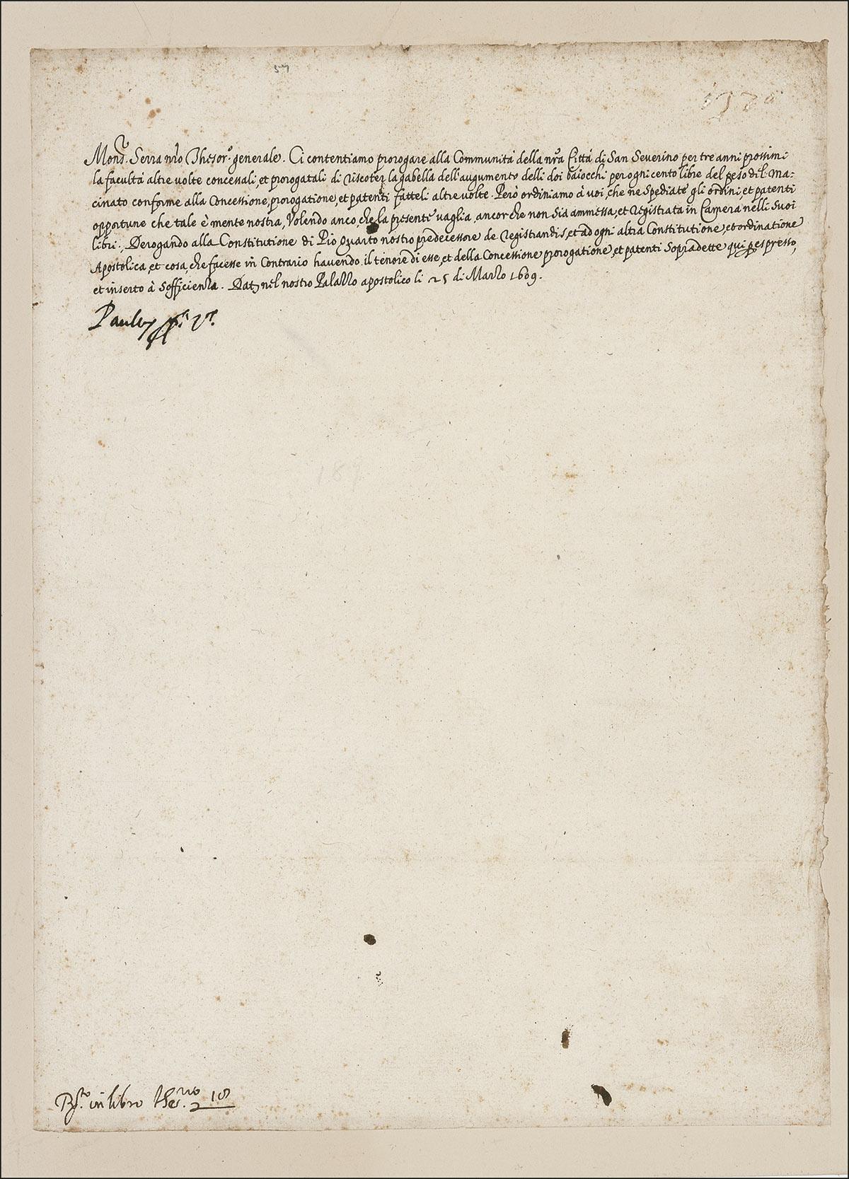 Born Camillo Borghese in Rome in 1550, Paul V reigned as pope from 1605 until his death in 1621. He also financed the completion of St. Peter's Basilica. LS in Italian, signed “Paulus pp V.,” one page, 8 x 11, March 25, 1609. Letter authorizing the municipality of San Severino to grant an extension of power to a tax of an additional 2 Baiocchi per 100 pounds of ground. This decision is consistent with the provision made in the past, extension and approval. Letter has been professionally inlaid to a slightly larger sheet. In fine condition, with scattered light toning and soiling, and a few stray ink marks. Pre-certified John Reznikoff/PSA/DNA and RRAuction COA.