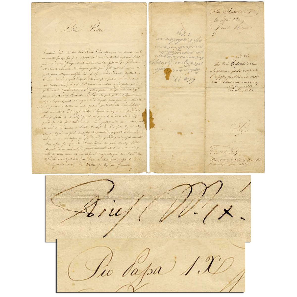 Pope Pius IX 1858 document signed. Written in Italian, 2pp. translates in part, ''…cannot be sustained for years of crop failure, having a large family he has had to borrow to provide for his wife and four small children…The captain asked him for a boat with wheels…and he accepted the deal hoping with the boat sale to pay off this debts…Monsignor Lolli has not paid…'' 8.75'' x 13'' card style document has light soiling, small area of discoloration and portion of first page cut out on the upper right side, not affecting content. Very good.