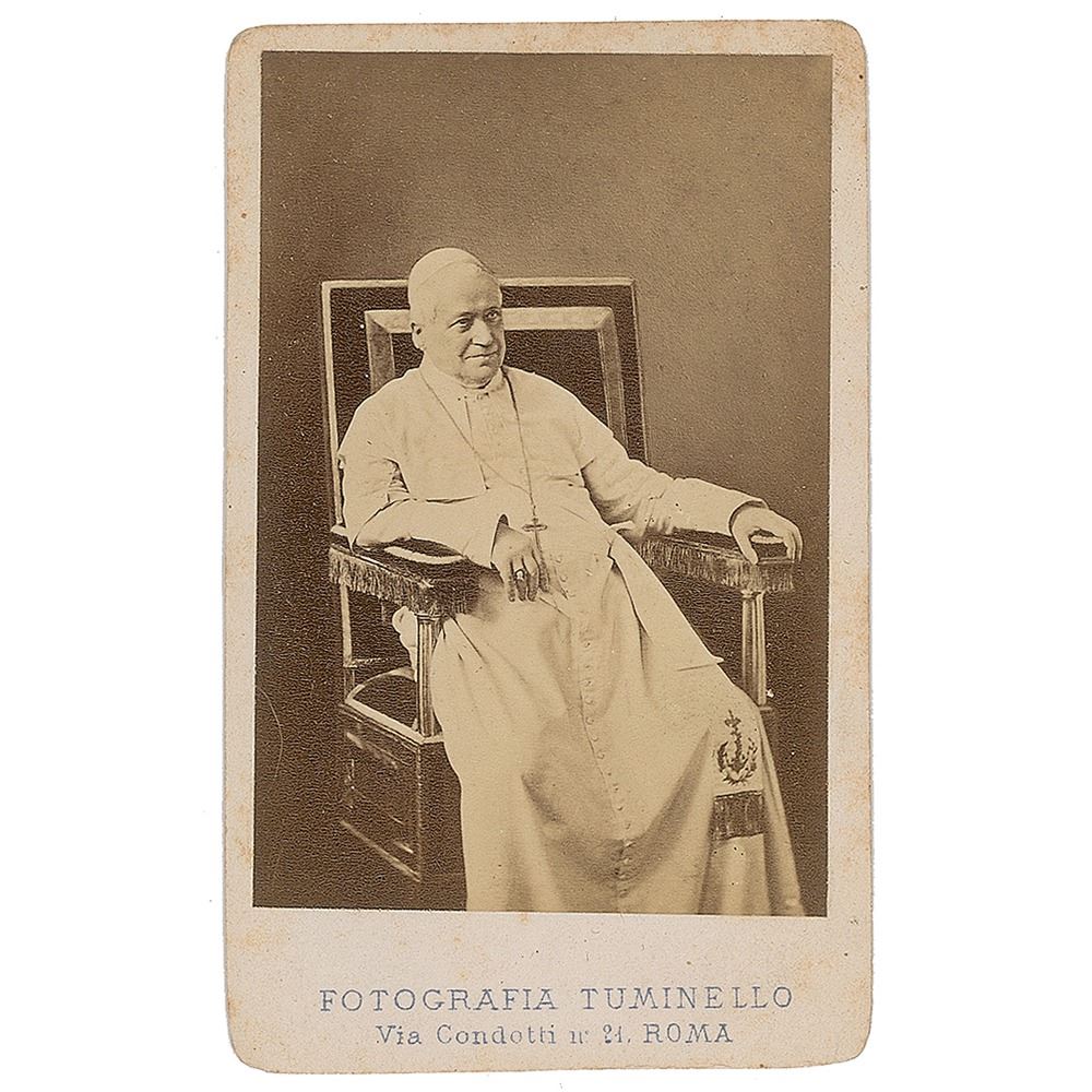 Original 2.5 x 4 carte-de-visite photograph of Pope Pius IX seated in an ornate chair, taken by Roman photographer Lodovico Tuminello. In fine condition. Pius IX was the first pope to be photographed.
