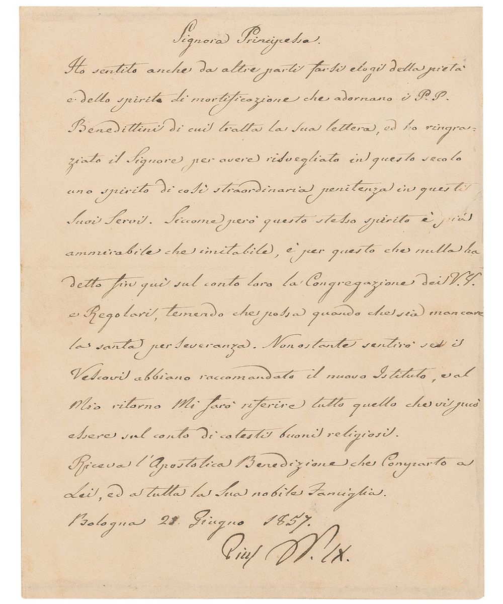 Italian pope (1792–1878), born Giovanni Maria Mastai-Ferretti, who ascended the papal throne in 1846 and served until his death. Among the notable achievements of his 32-year reign, the longest in Roman Catholic Church history, Pius convened the historic First Vatican Council, which included the doctrine of papal infallibility. LS in Italian, signed “Pius PP. IX,” one page, 7.5 x 9.5, June 28, 1857. Letter to an unidentified princess. In part (translated): “I have heard much praise from several sources concerning the piety and the spirit of mortification which grace the holy Benedictine fathers you discuss in your letter and I thank God for having awakened in this century such an extraordinary spirit of penitence in them, His Servants. But since that same spirit is easier to admire than to imitate…I fear that holy perserverance may be lacking…On my return…I will review the entire dossier concerning these good priests…Receive the Apostolic Benediction which I bestow upon you and all your noble Family.” Page is affixed to an identical size page. In very good condition, with repaired tear to top right, central horizontal and vertical fold, one passing through a single letter of signature, and some light toning and soiling. Pius IX was unhappy with "this century" and often denounced it.