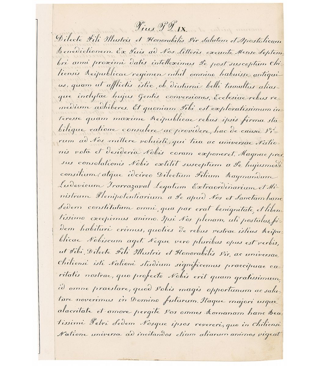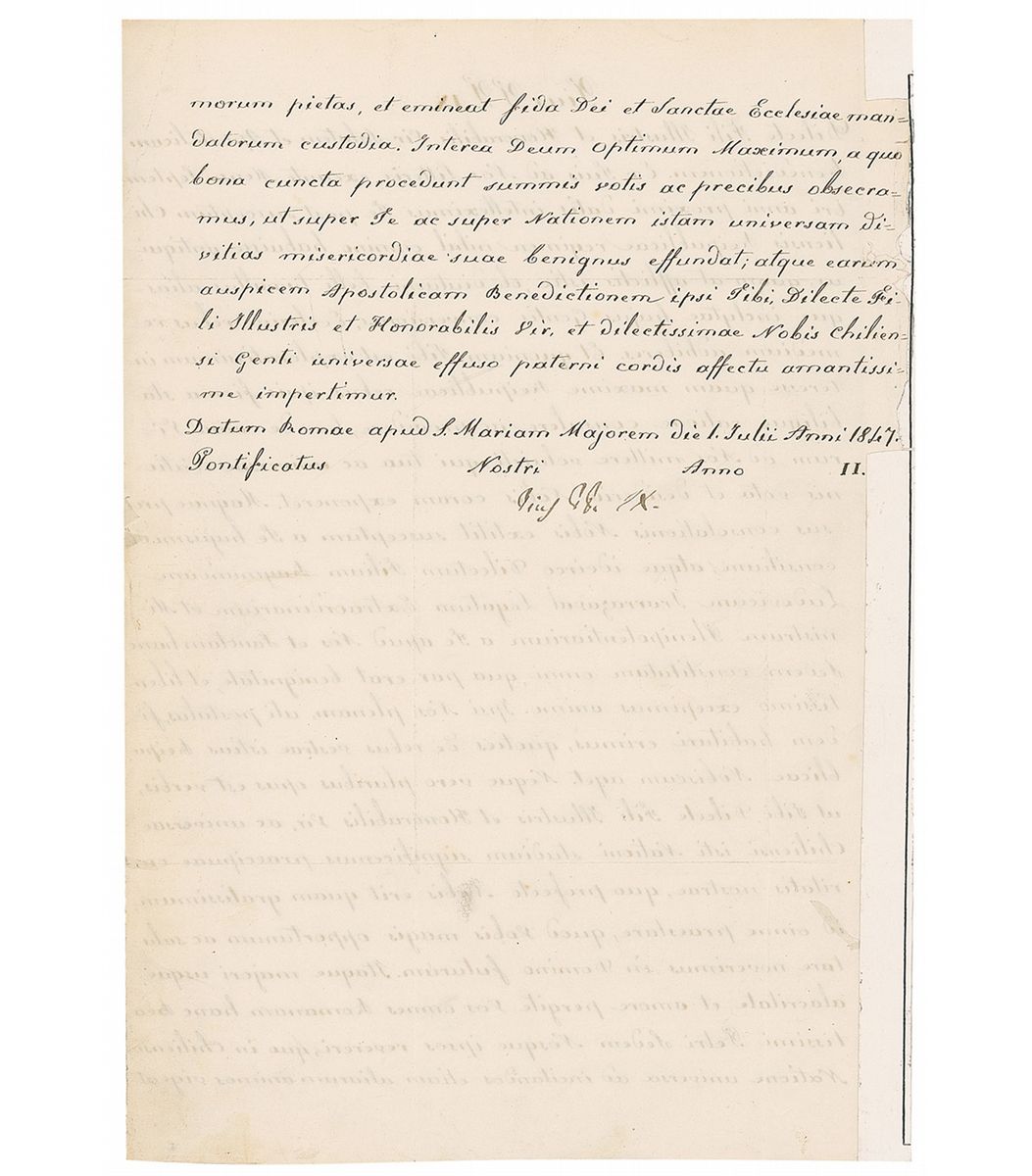 Italian pope (1792–1878), born Giovanni Maria Mastai-Ferretti, who ascended the papal throne in 1846 and served until his death. Among the notable achievements of his 32-year reign, the longest in Roman Catholic Church history, Pius convened the historic First Vatican Council, which included the doctrine of papal infallibility. LS in Latin, signed “Pius PP. IX,” one page both sides, 8.5 x 12.5, July 1, 1847. Letter to the president of Chile bestowing his apostolic blessing and designating an ambassador. Intersecting folds, thin mounting strip to vertical edge of both sides, and some scattered light toning, otherwise fine condition.