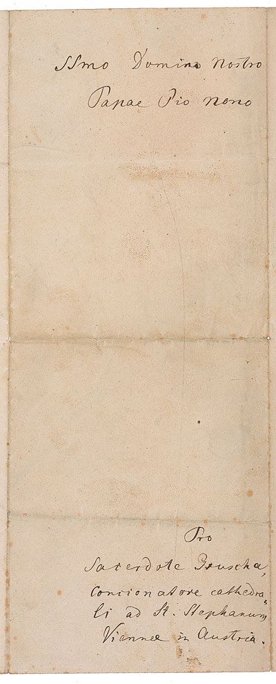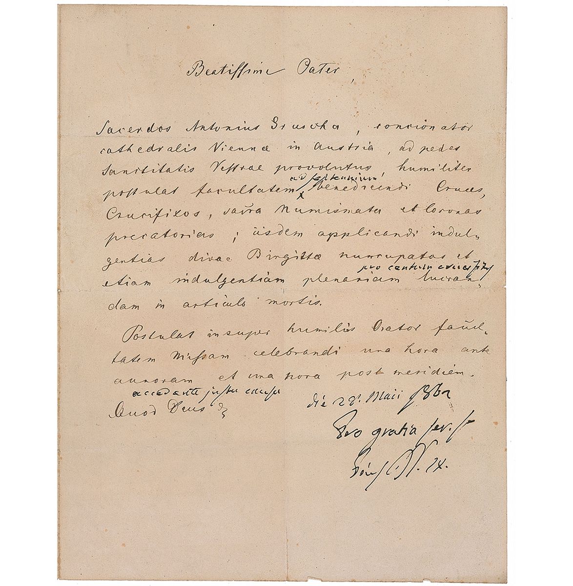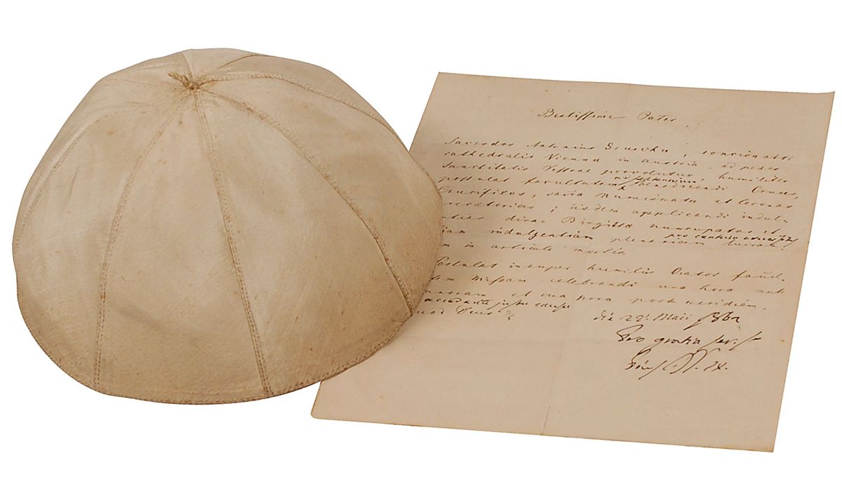 Italian pope (1792–1878), born Giovanni Maria Mastai-Ferretti, who ascended the papal throne in 1846. Among the notable achievements of his 32-year reign, the longest in Roman Catholic Church history, Pius convened the historic First Vatican Council, which included the doctrine of papal infallibility. Endorsement and solideo: Ink endorsement, in Italian, signed “28 Mai 1862, Pius PP. IX,” at the conclusion of a one page letter to the Pope, 7.5 x 10. Letter is a petition to Pope Pius IX from a priest asking permission to use holy relics and other religious mementos, boldly endorsed at the conclusion, “Pro gratia fev. Pius PP. IX.”; and Pius XI’s papal solideo. White cloth solideo measures 7.5? in diameter and rests on a wood and padded mold to retain its shape. Solideo is housed in a 10 x 12.5 x 10 Lucite display case with a plaque that reads, “Pio Nono’s Solideo 1862, formally in the possession of Cardinal Innitzer, Archbishop of Vienna.” The white solideo comes from the collection of Lord St. John of Fawsley, along with the letter. Letter is in fine condition, with intersecting folds. Solideo is also in fine condition. Accompanied by a copy of a letter from Holloway’s Auctioneers stating the solideo comes from the collection of Fawsley. Norman St John-Stevas, Baron St John of Fawsley, a British politician, author, and barrister. A devout Roman Catholic he amassed a large collection of royal and Victorian items, including the solideo offered here. Also accompanied by two other photos of cardinals, signed and inscribed to Fawsley, and a photo of Pius in a similar solideo. Any ordained member of the Roman Catholic Church is entitled to wear a black solideo, with white ones reserved only for popes. Personal items of any pope are seldom offered for sale to the public, and such a personal item from the longest reigning Pope in the history of the Church, even more so. Provenance: collection of Lord St. John of Fawsley; Holloway’s 2012.