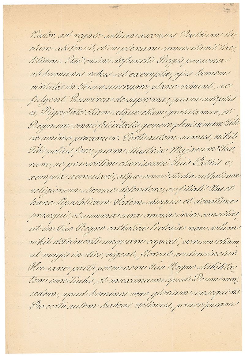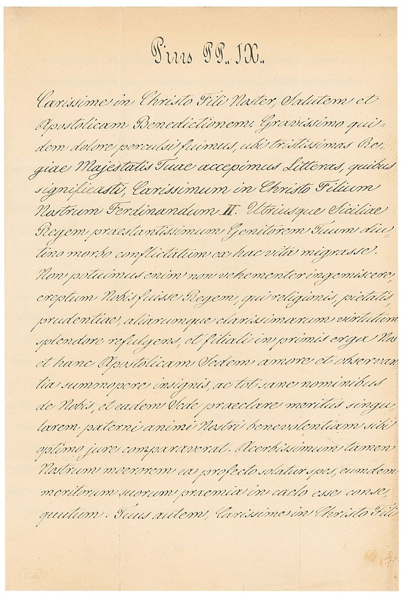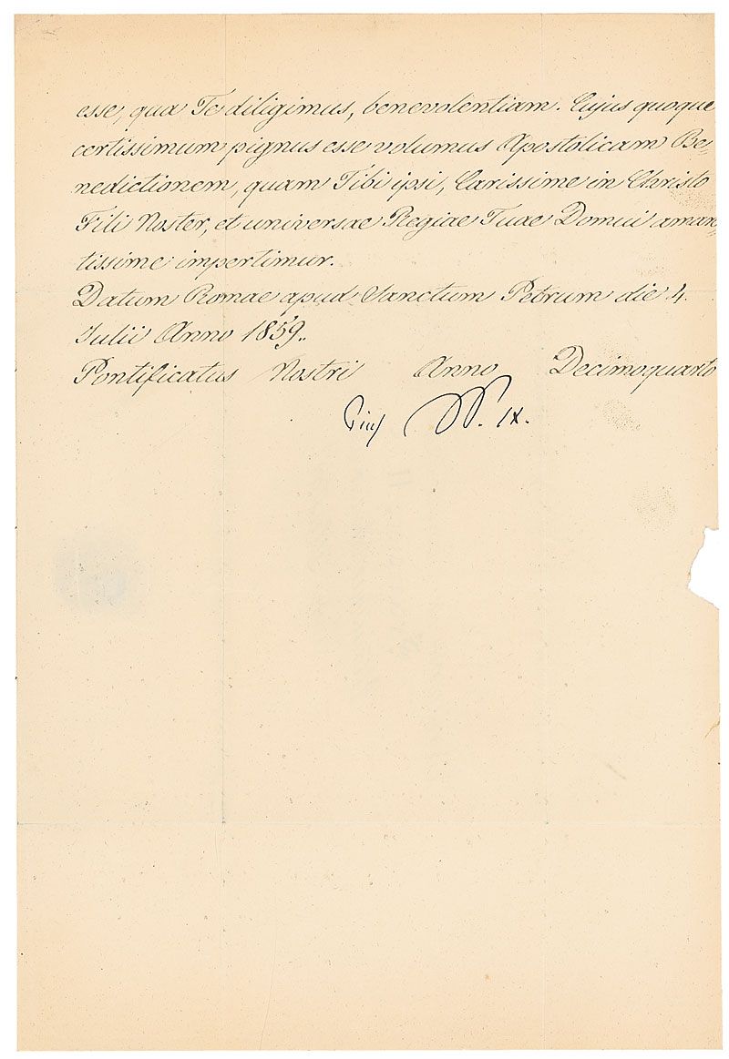 Italian pope (1792–1878), born Giovanni Maria Mastai-Ferretti, who ascended the papal throne in 1846. Among the notable achievements of his 32-year reign, the longest in Roman Catholic Church history, Pius convened the historic First Vatican Council, which included the doctrine of papal infallibility. LS in Latin, signed “Pius PP. IX.,” three pages on two adjoining sheets, 9 x 13, 1859. Crisply penned untranslated letter to Francisco II. Reverse of second page bears an address panel in another hand and retains most of its red wax seal. In fine condition, with intersecting folds and a small area of paper loss to edge of second page from seal.