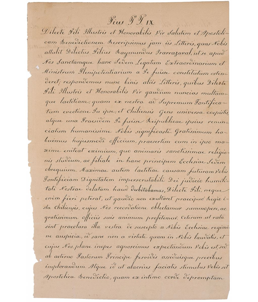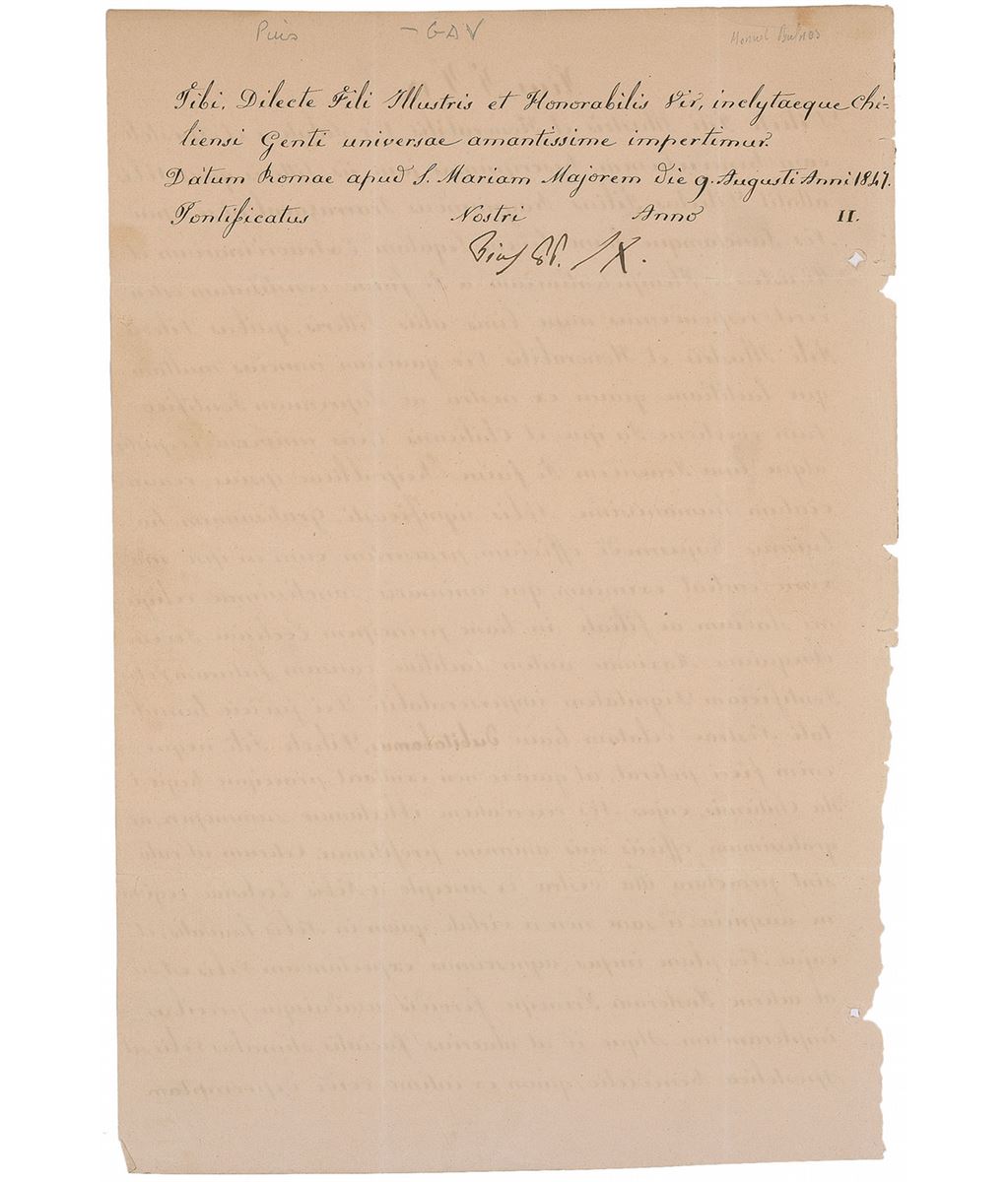 Untranslated manuscript DS in Latin, signed “Pius PP IX,” one page both sides, 8 x 12, August 9, 1847. Expected document wear, scattered creases, and chips and tears to one edge, otherwise fine condition.