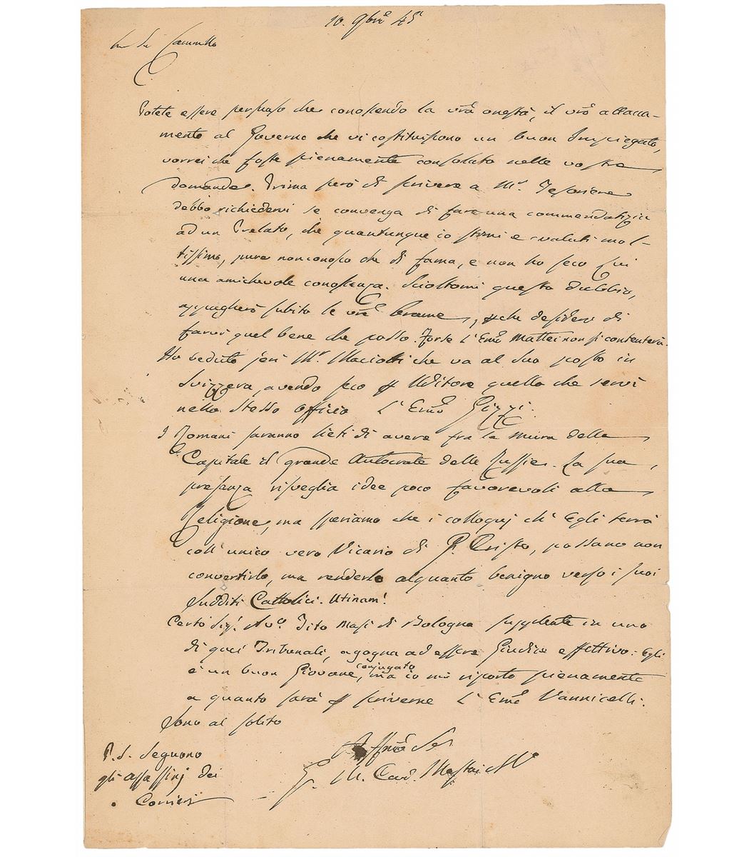 ALS in Italian, signed “G. M. Card. Mastai A V,” one page, 8 x 11.5, November 10, 1845. Letter to the secretary of state of the papal ministry Camillo Alessandroni Minuti about the forthcoming visit of Czar Nikolaus I in Rome, hoping the occasion will do something against the persecution of the Catholics in Russia. Second integral page bears an address panel in another hand. In very good condition, with intersecting folds, one lightly affecting a single letter of the signature, scattered mild toning and soiling, reinforcement to hinge and folds of address panel, and light wrinkling.