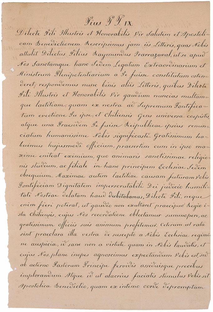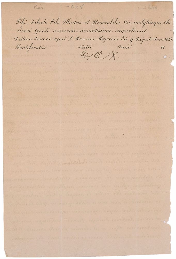 Untranslated manuscript DS in Latin, signed “Pius PP IX,” one page both sides, 8 x 12, August 9, 1847. Expected document wear, scattered creases, and chips and tears to one edge, otherwise fine condition.