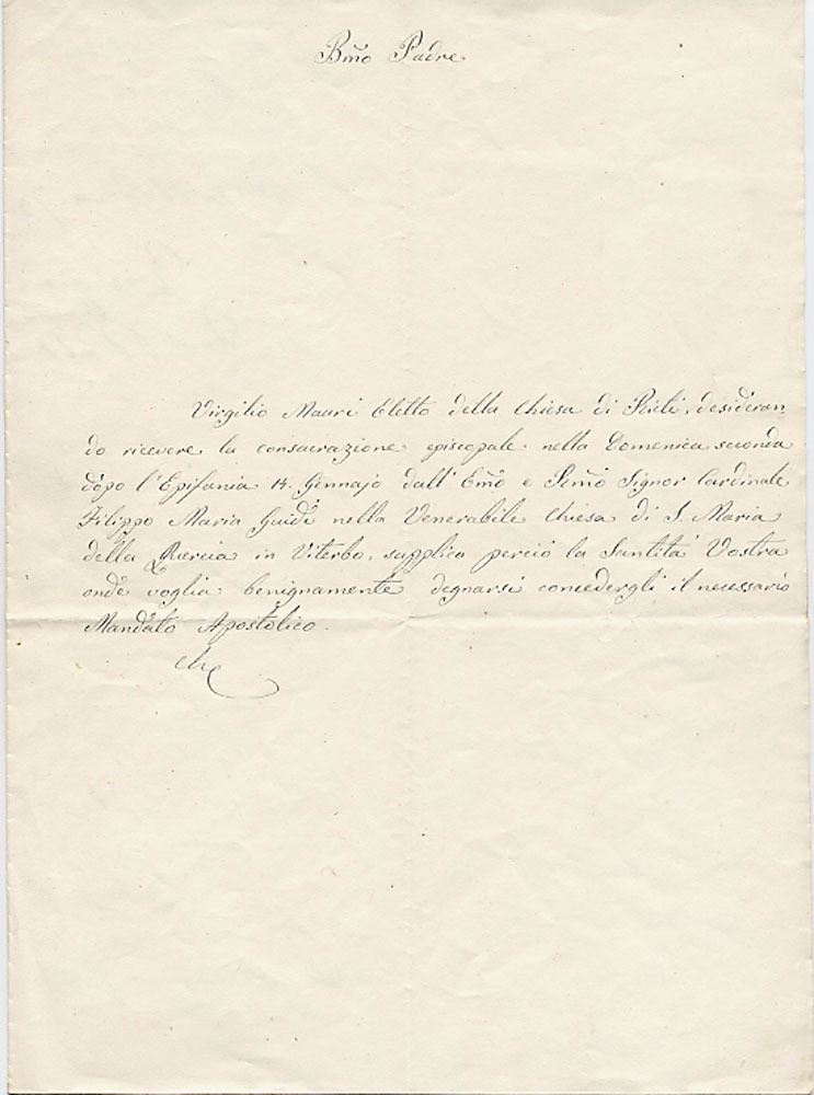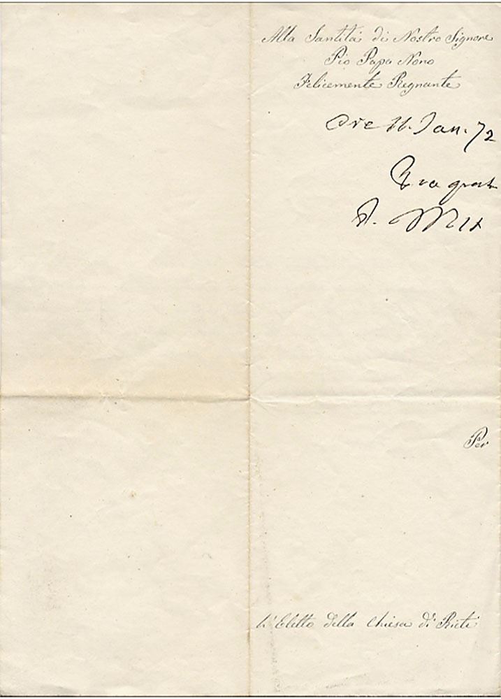 Born Giovanni Maria Mastai-Ferretti in 1792, he served as pope for a record 31 years, 7 months and 23 days, beginning on June 16, 1846, until his death in 1878. Endorsement on the reverse of an undated letter to Pius IX from the future Bishop of Rieti, one page, 7.75 x 10.75, requesting that he be consecrated on the second Sunday of January by Cardinal Filippo Maria Guida. Endorsed on the reverse in black ink, "Ave 11, Jan. 72…Pius I." In fine condition.