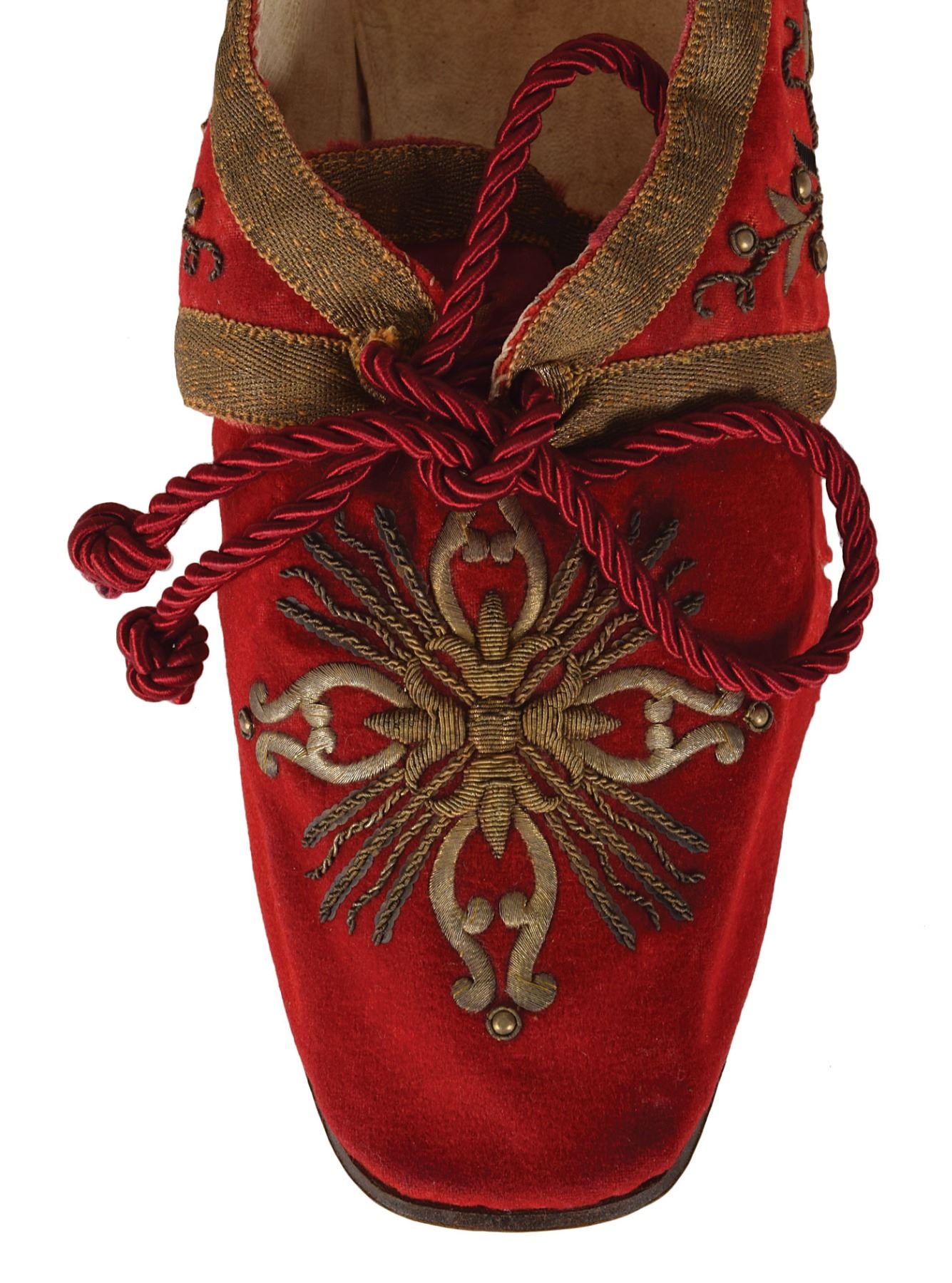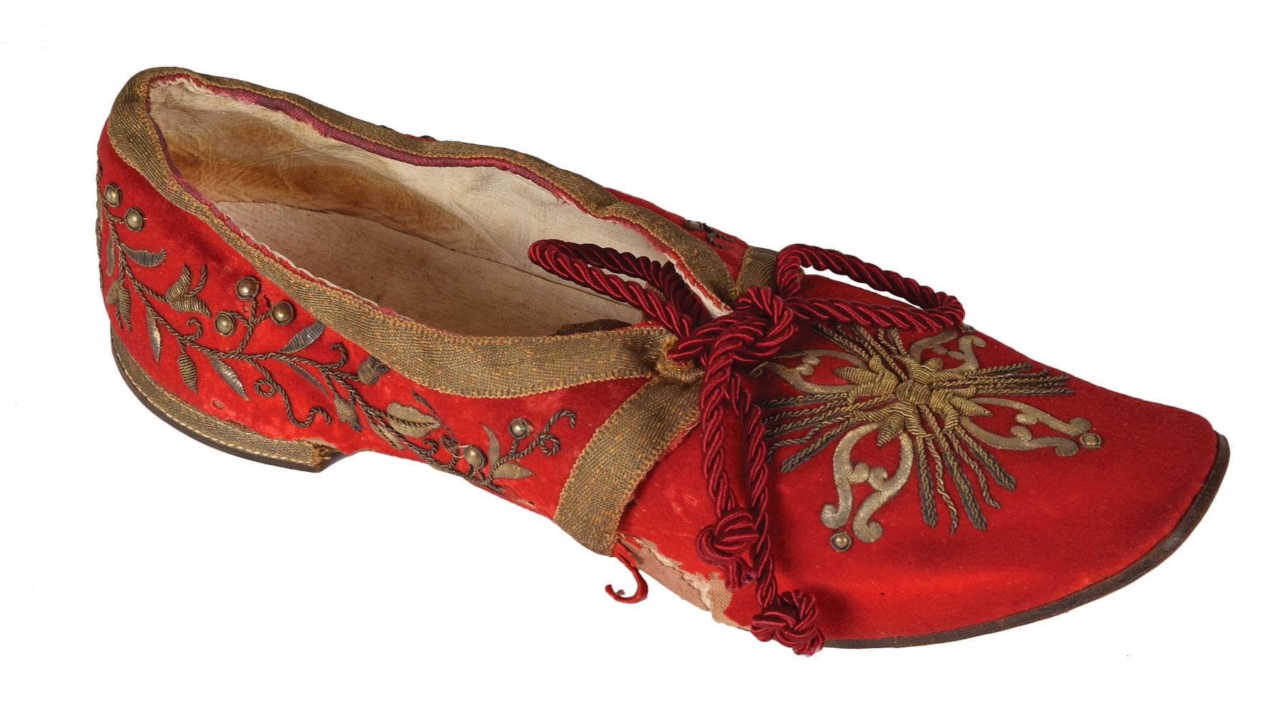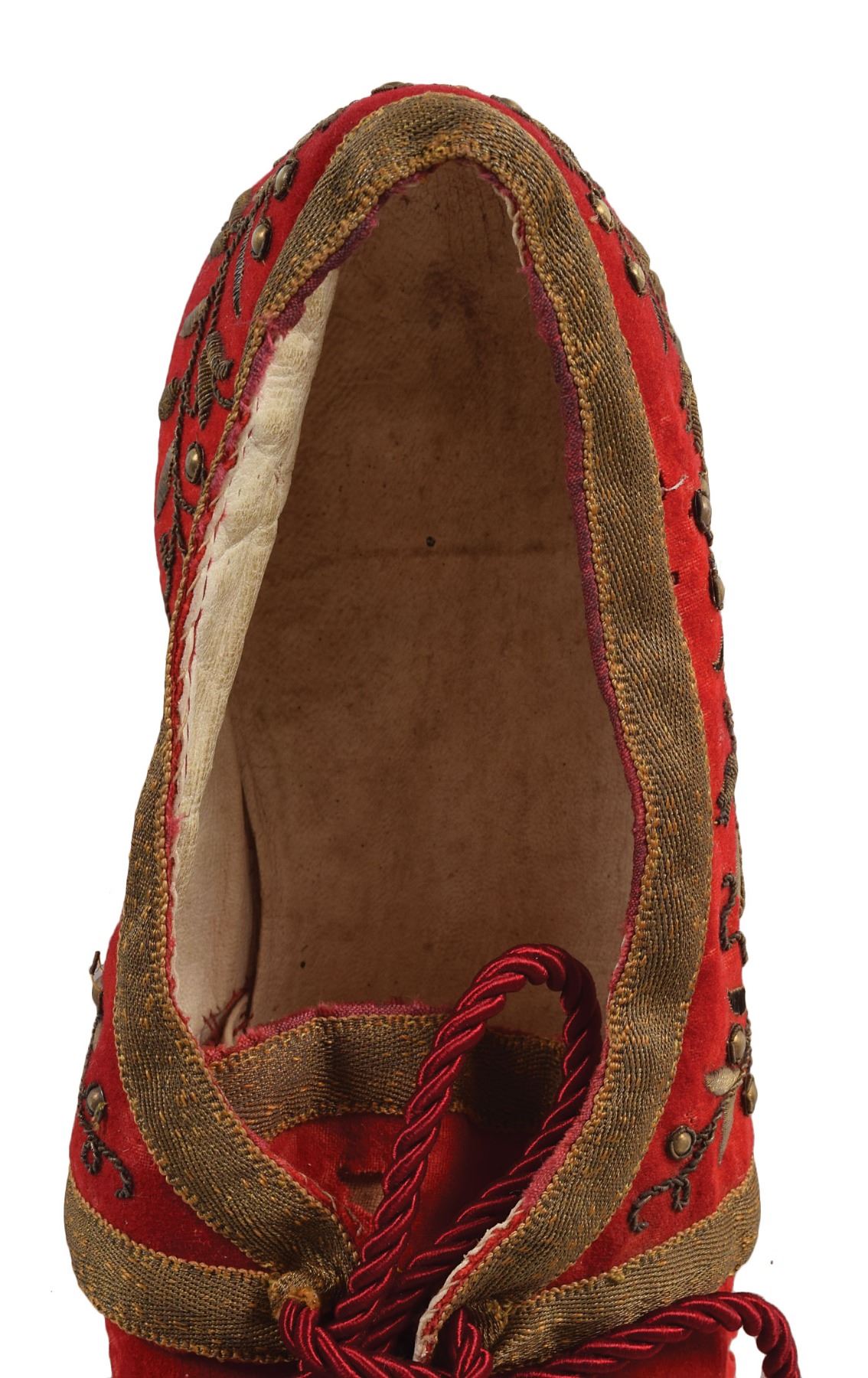 Ornate red velvet shoe with leather sole attributed to Pope Pius IX, measuring 11? long, featuring discolored yellow-gold bands trimming the edges with matching ornate embroidery on the top and sides of the foot, and a thick red rope shoelace. In very good condition, with some areas of damage and loss of material, and overall expected wear. Accompanied by a letter of authenticity from Fr. Richard Kunst, the curator of papalartifacts.com, in part: "Red shoe worn by Bl. Pope Pius IX (1846–1878). Based on my years of experience and compared to other shoes from the same pontiff I consider this shoe to be certainly authentic."