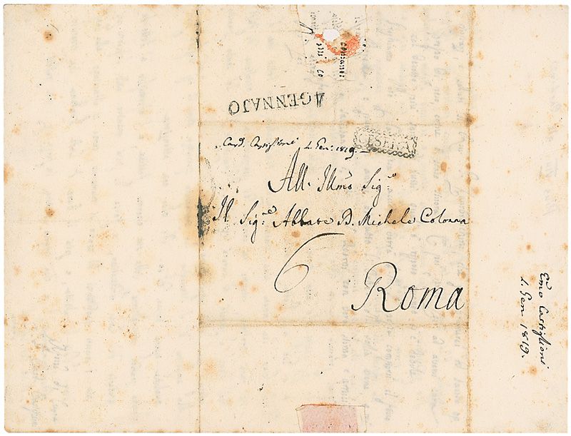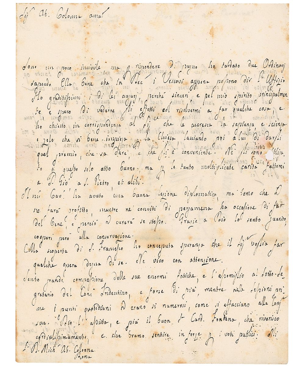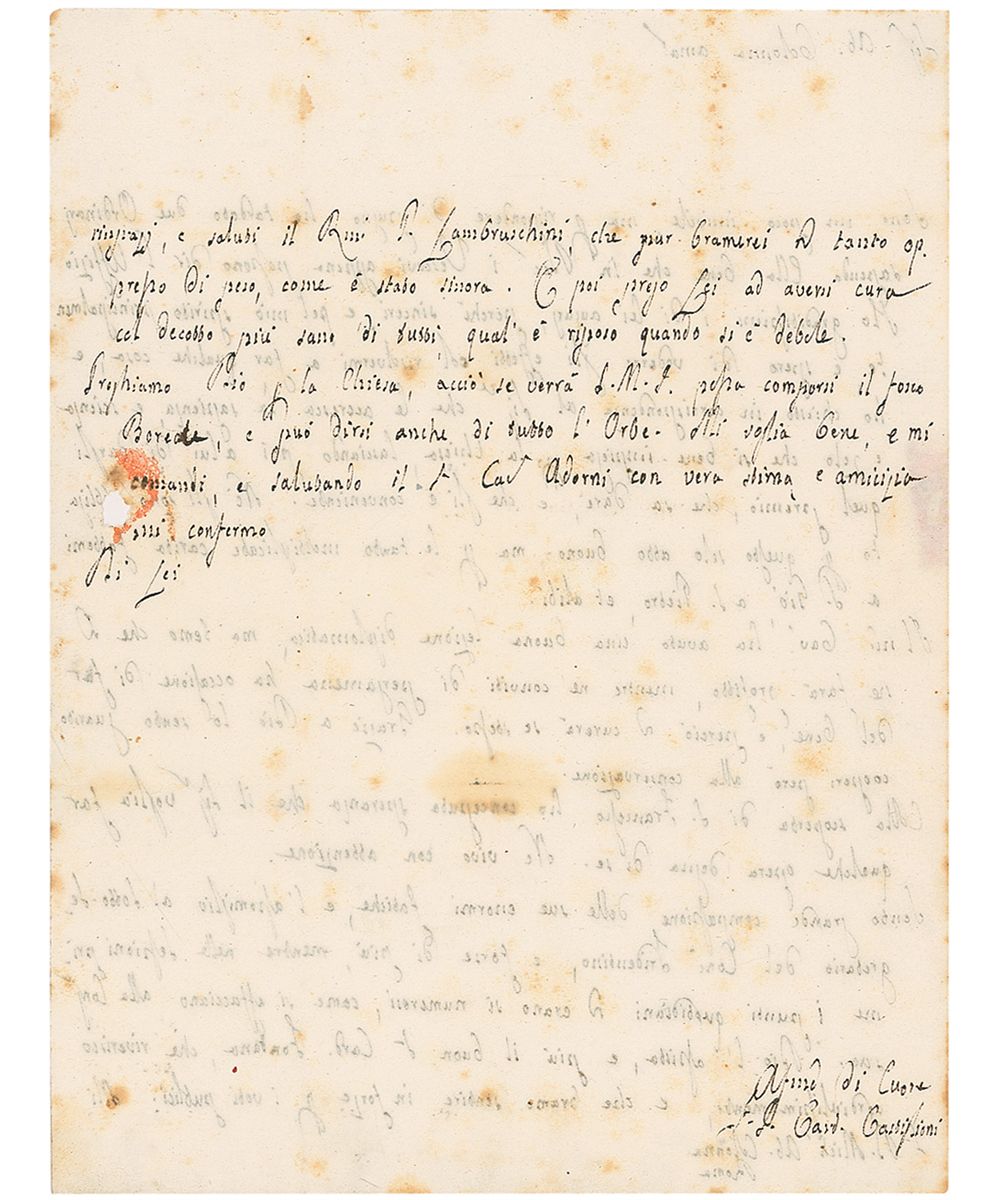 Born Francesco Xaverio Castiglione, pope from 1829–1830, a mere twenty months of reign. ALS in Italian, signed “F. S. Card Castiglioni,” one page both sides, 7.25 x 9.75, no date. Crisply penned untranslated letter. Reverse of second integral page bears an address panel in another hand. In very good condition, with intersecting folds, scattered toning, and paper loss to second page from the wax seal.
