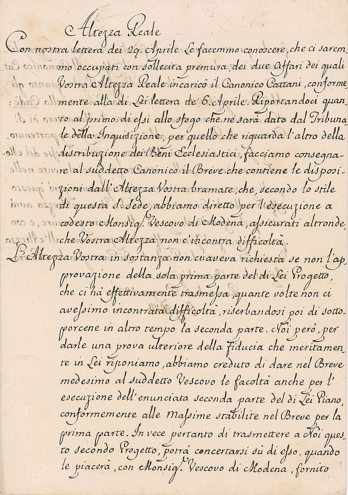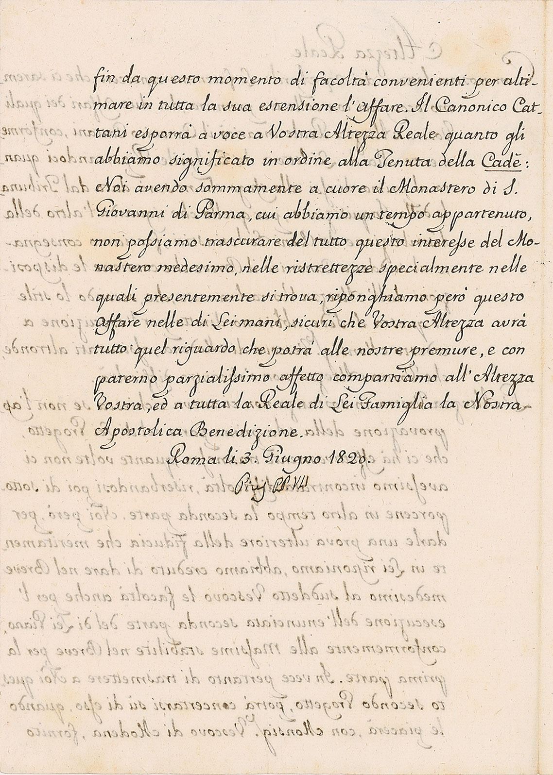 Born Barnaba Niccolò Maria Luigi Chiaramonti in 1742, he served as Pope from 1800 until his death in 1823; he was taken prisoner and transported to France in 1809 during the Napoleonic Wars, remaining there until 1814 when, after the French were defeated, he was permitted to return to Rome, where he was greeted warmly as a hero and defender of the faith. Manuscript DS, in Italian, signed “Pius PP. VII,” one page both sides, 8 x 11.5, June 3, 1820. Letter to Francis IV, Duke of Modena, informing him that he has given to the Bishop of Modena full power in order to resolve all problems between the Church and the Duchy, signed at the conclusion as Pope. In fine condition, with writing showing through from opposing sides.