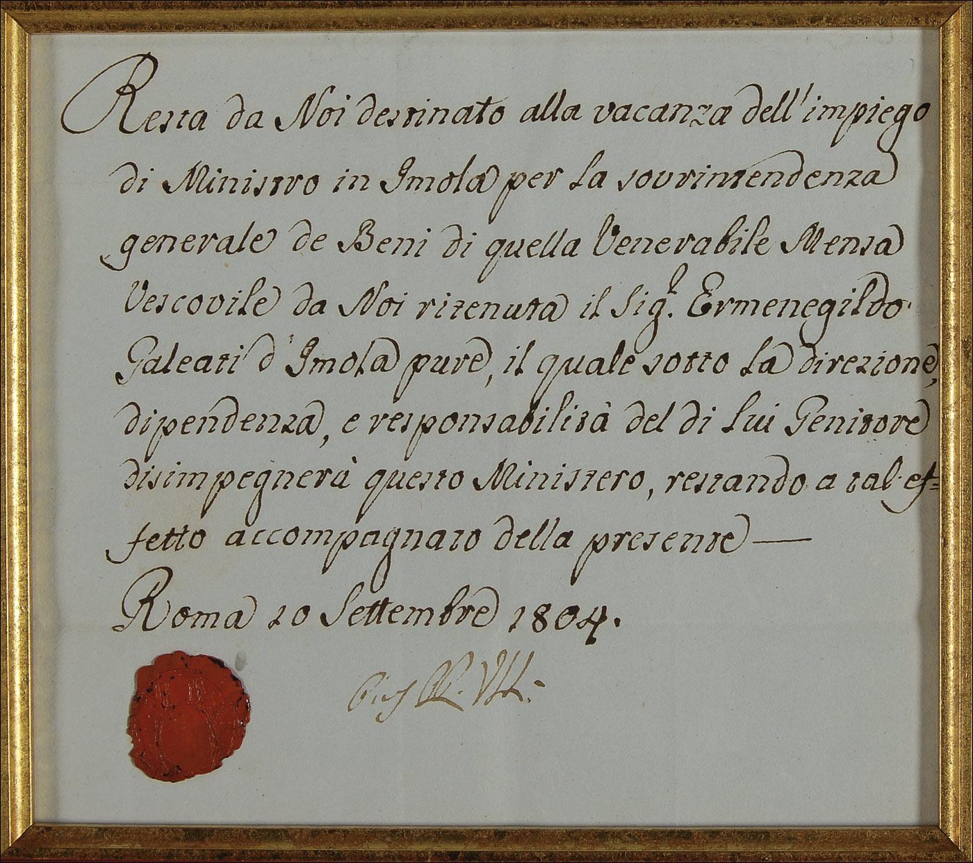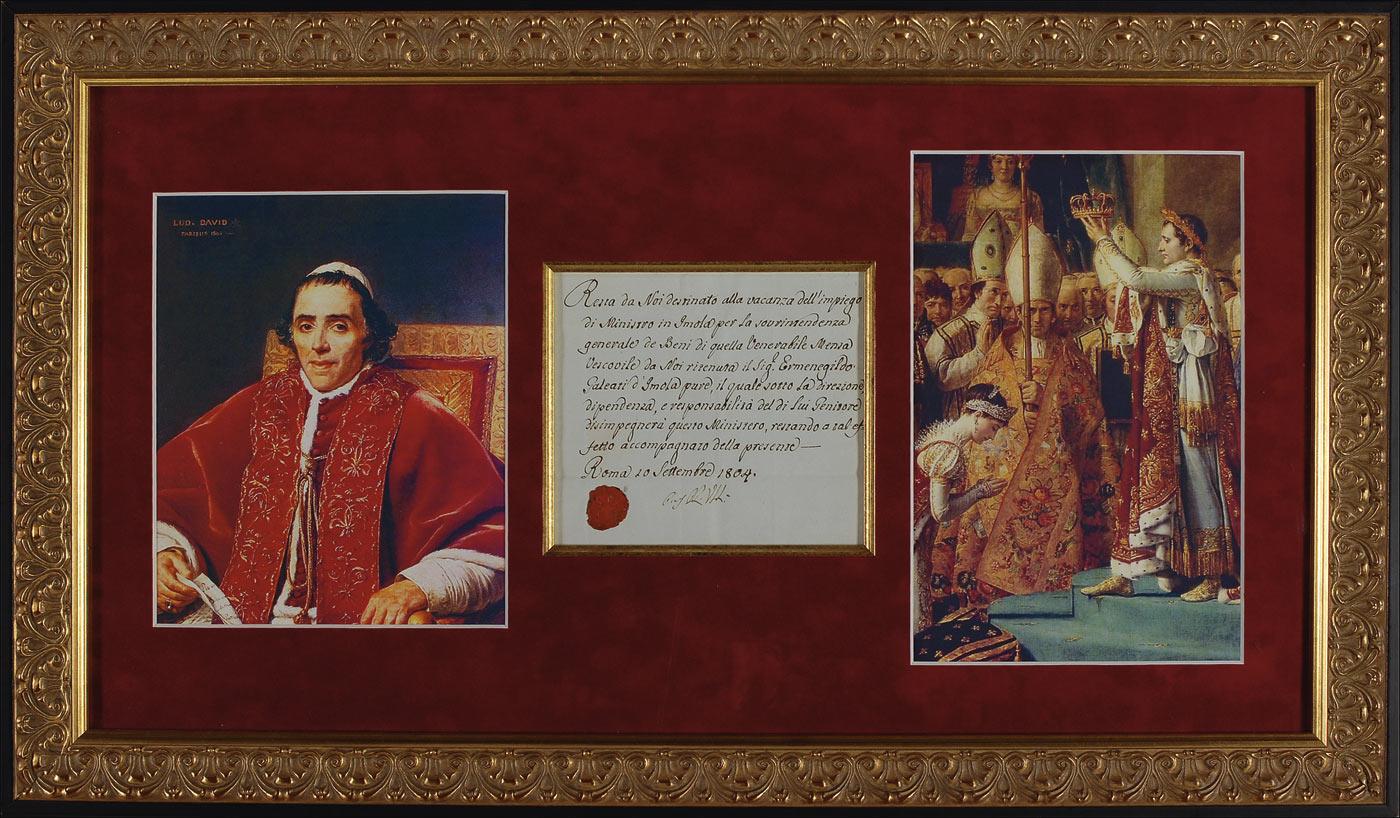 Born Count Barnaba Niccolò Maria Luigi Chiaramonti, Pope from 1800-1823. Manuscript DS, in Italian, signed “Pius PP. VII,” one page, 6.25 x 5.5, September 20, 1804. Very nicely penned untranslated document, signed at the conclusion as Pope. Suede matted and framed with a color portrait of Pius, and a color portrait of Pius at Napoleon’s coronation, to an overall size of 28 x 16.25. In fine condition, with intersecting folds, one through a single letter of signature, and Pius’s signature a shade or two lighter than the text. The red wax seal is cracked, but mostly intact. Oversized. Pre-certified PSA/DNA and RRAuction COA.