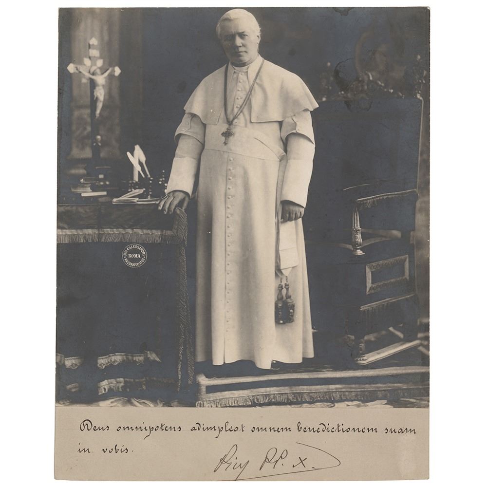 Vintage matte-finish 7.75 x 8.5 full-length photo by d'Alessandri of Rome, affixed to a slightly larger mount, signed on the mount in fountain pen, "Pius PP. X," with a sentiment in Latin written above the signature in another hand and a photographer's stamp to left side of image. In very good to fine condition, with trimmed edges, and silvering to the darker areas of the photo.