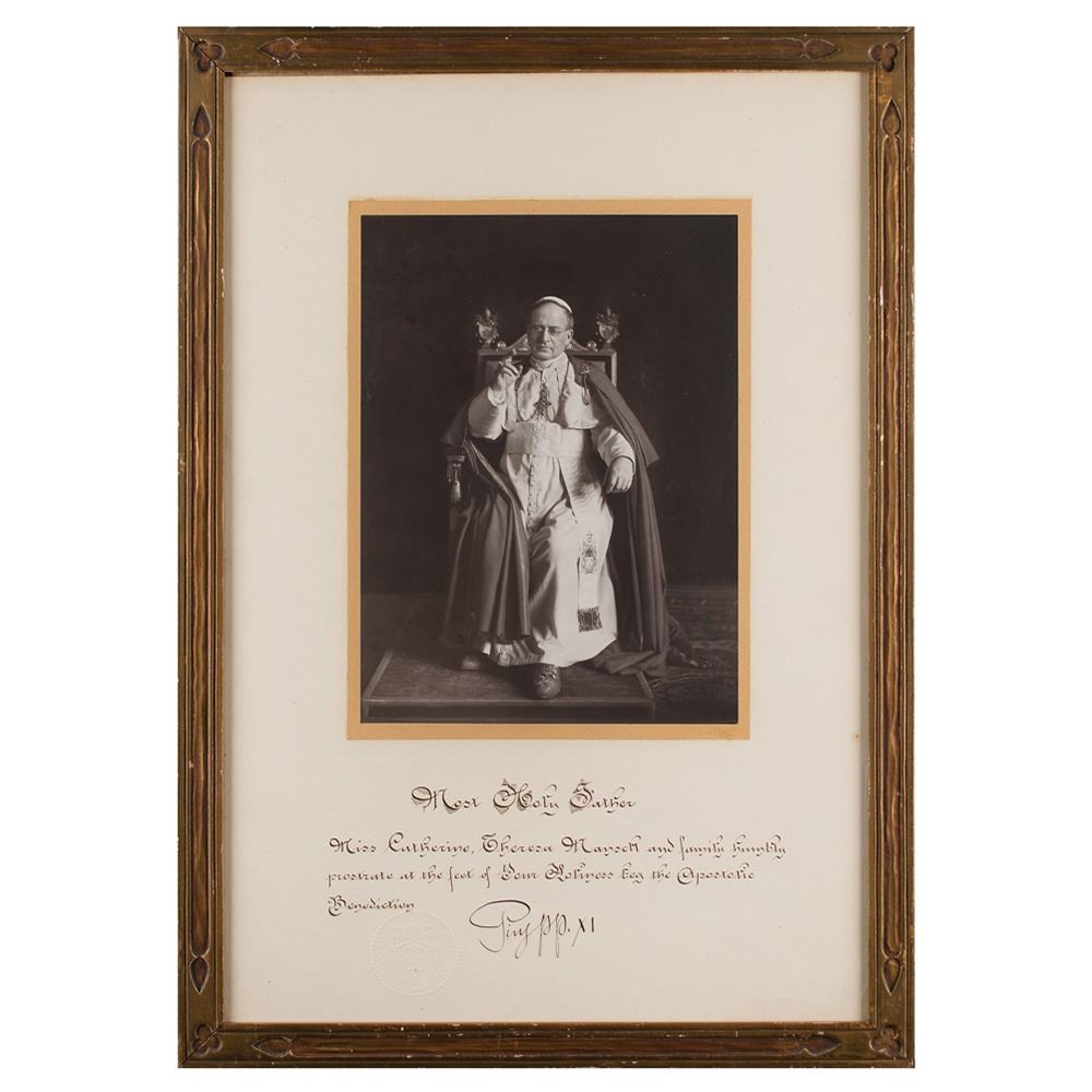 Impressive matte-finish 8.25 x 11.25 photo of Pope Pius XI, affixed to its original 14 x 21 mount, signed below a calligraphic apostolic benediction in ink, "Pius P.P. XI." The apostolic benediction reads: "Most Holy Father, Miss Catherine Theresa Marsett and family humbly prostrate at the feet of Your Holiness beg the Apostolic Benediction." Framed under premium UV protected anti-glare glass to an overall size of 16 x 23. In fine condition, with a light stain to the bottom edge.